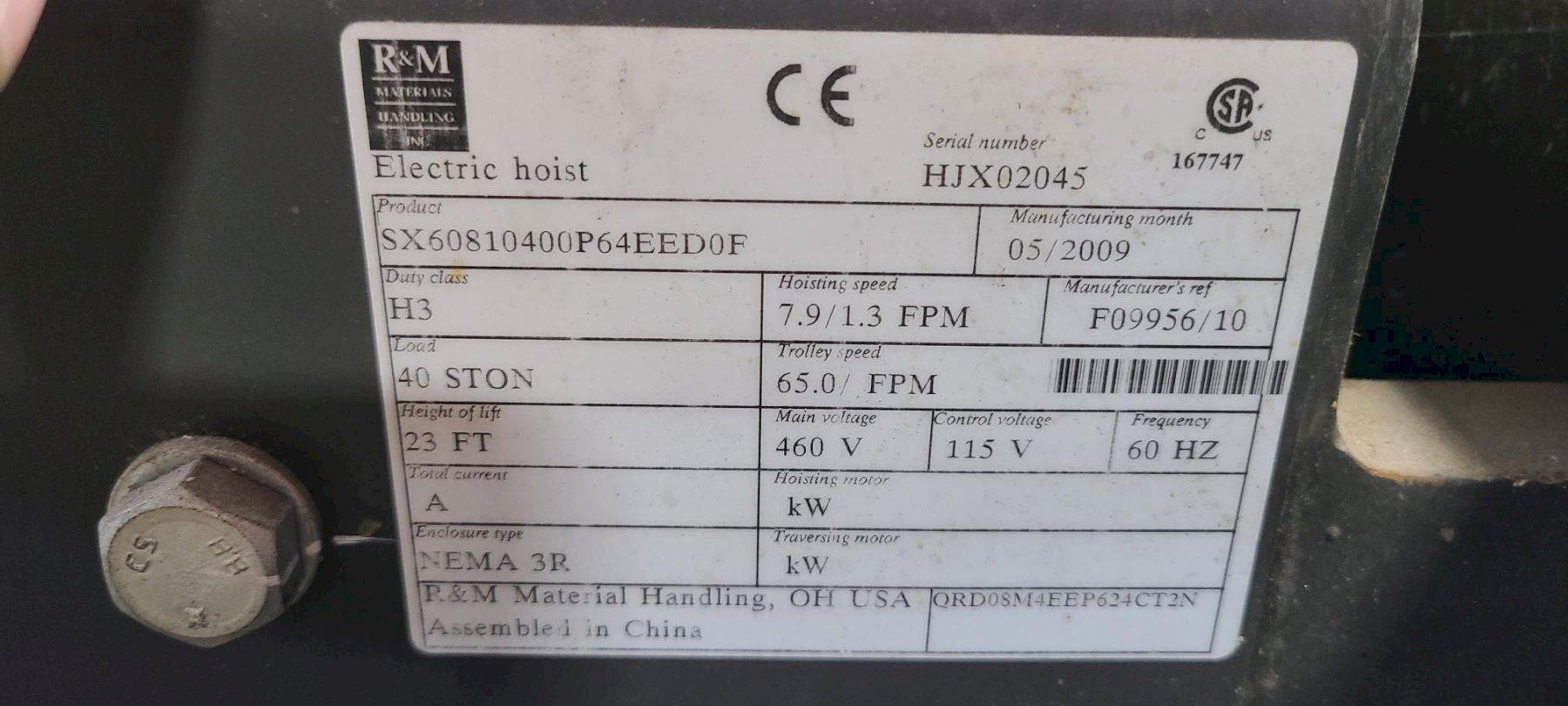 All specifications are assumed to be correct but must be confirmed by the purchasing entity.,Two (2) 40-ton hoists on one bridge, All specifications are assumed to be correct but must be confirmed by the purchasing entity.,The span is 40’ center to center of the rails. All specifications are assumed to be correct but must be confirmed by the purchasing entity.,Approx. 65’ of rail avaialble for this system. All specifications are assumed to be correct but must be confirmed by the purchasing entity.,23 ft. lift height All specifications are assumed to be correct but must be confirmed by the purchasing entity.,Trolley Speed: 65 FPM Hoisting Speed: 7.9/1.3 FPM All specifications are assumed to be correct but must be confirmed by the purchasing entity.,Duty Class: H3 All specifications are assumed to be correct but must be confirmed by the purchasing entity. |