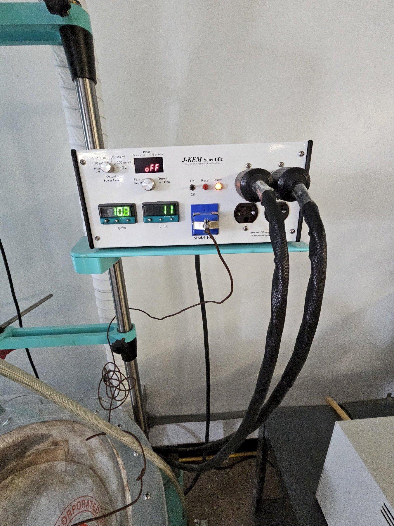 All specifications are assumed to be correct but must be confirmed by the purchasing entity.,-EcoChyll Condensor/Chiller – 230VAC 1PH, 20A -J-KEM Scientific Temp Controller and Power Supply for Vacuum Pump and Agitator – 230VAC 1PH, 30A -Welch 202801 Vaccum Pump – 115VAC 1PH, 1.5A (powered by controller) -Caframo 1850 Agitator – 120VAC 1PH, 3.0A (powered by controller) -Heating Mantle: Chemglass ECO-7000-72L All specifications are assumed to be correct but must be confirmed by the purchasing entity. |