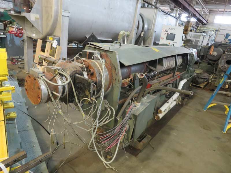 All specifications are assumed to be correct but must be confirmed by the purchasing entity.,-Gearbox: Reduction Ratio Of 7:1 Is -Belt Driven -150 Hp D/C Motor -3½” Diameter Round on Center Feed Throat Entrance Beringer 4.5″ -Model 17 Screen Changer -Less Hydraulic Cylinder Mounted on the Extruder Discharge All specifications are assumed to be correct but must be confirmed by the purchasing entity.  |