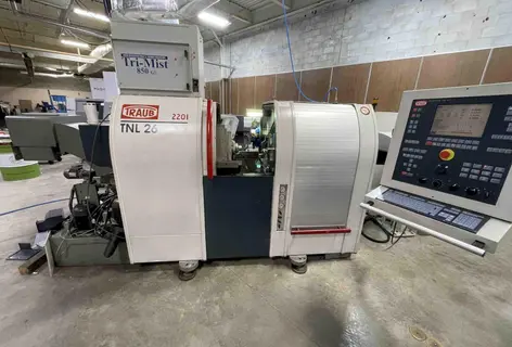 All specifications are assumed to be correct but must be confirmed by the purchasing entity.,Tool Carrier 1 Capacity: 12 Tools X-Axis Stroke: 1.97″ (50 mm) Y-Axis Stroke: +/- 0.79″ (20 mm) All specifications are assumed to be correct but must be confirmed by the purchasing entity.,Tool Carrier 2 Capacity: 12 Tools X-Axis Stroke: 1.97″ (50 mm) Y-Axis Stroke: +/- 0.79″ (20 mm) Z-Axis Stroke: 3.94″ (100 mm) All specifications are assumed to be correct but must be confirmed by the purchasing entity.,Tool Carrier 3 (Front) Capacity: 5 Tools Diameter of Mount: 1.57″ (40 mm) Spacing: 2.13″ (54 mm) X-Axis Stroke: 14.57″ (370 mm) Z-Axis Stroke: 9.84″ (250 mm) All specifications are assumed to be correct but must be confirmed by the purchasing entity.,Tool Carrier 4 (Rear) Capacity: 5 Tools Diameter of Mount: 1.57″ (40 mm) Spacing: 2.13″ (54 mm) X-Axis Stroke: 2.87″ (73 mm) Y-Axis Stroke: +/- 1.97″ (50 mm) Option All specifications are assumed to be correct but must be confirmed by the purchasing entity.,Approx Dimensions: 146″ x 51″ x 65″ Approx Machine Weight: 8,820 lbs All specifications are assumed to be correct but must be confirmed by the purchasing entity.,EQUIPPED WITH: Traub System TX 8i CNC Control EIA and ISO Code RS-232 Interface Full C-Axis for Main & Opposed Spindles Pneumatic Guide Bushing Adaptive Air Pressure Option 34 Total Tool Holding (12 + 12 + 5 + 5 Stations) Double Tool Capacity Compatible LNS Hydrobar Express 326-S2 Bar Feeder Tri-Mist 850 Mist & Smoke Collector Knoll Chip Conveyor Lubricoolant System New Set of 27mm Channels Tooling Included- Live Tools, Angle Adjustable Head All specifications are assumed to be correct but must be confirmed by the purchasing entity. |
