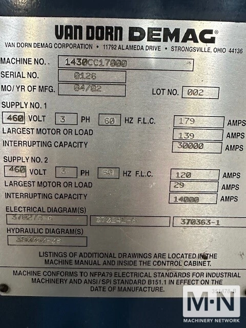 OverviewDescription1430 TON 363 OZ VAN DORN MODEL 1430CC17000 INJECTION MOLDING MACHINE MFG 2002 P3000 CONTROL