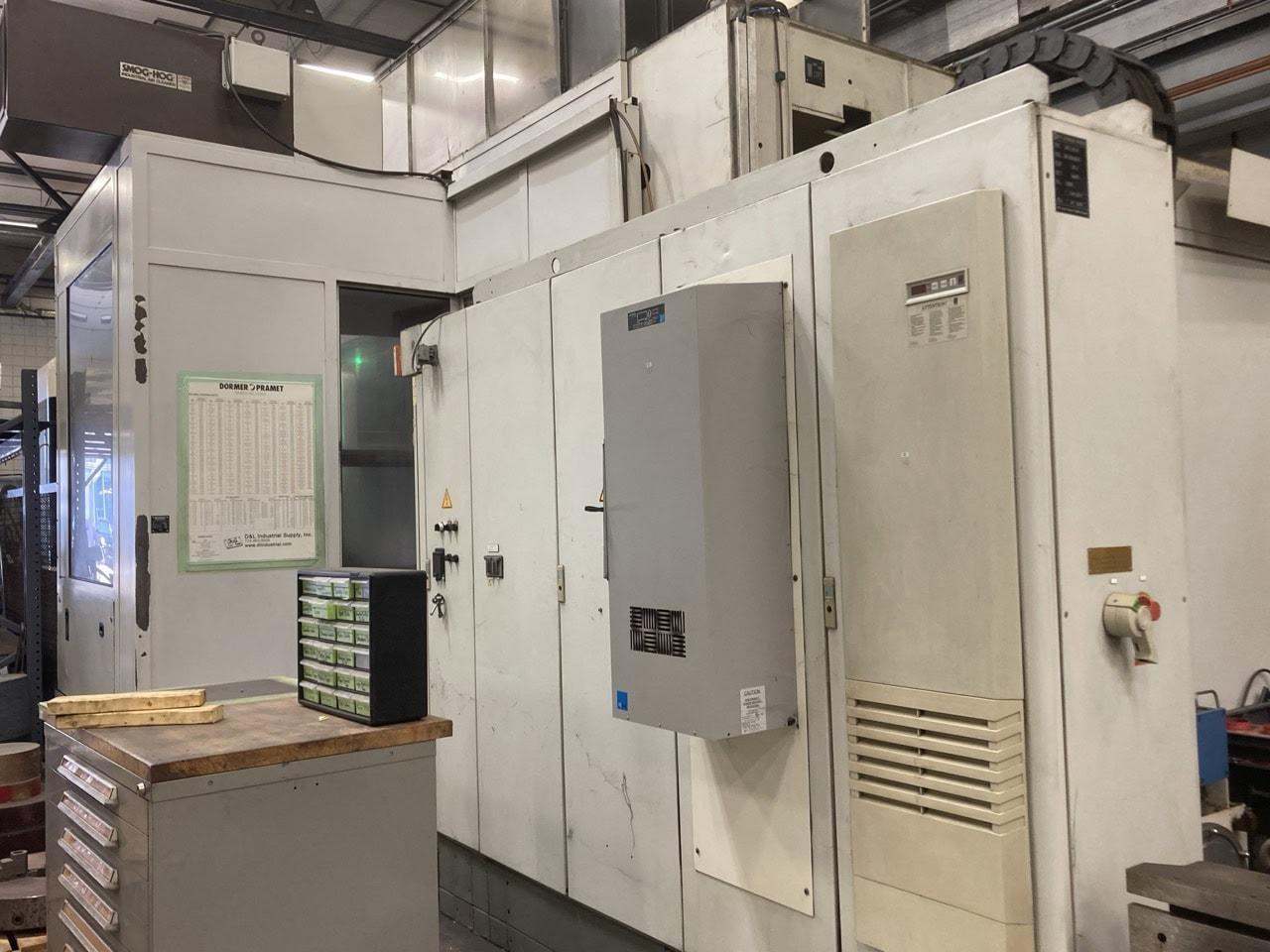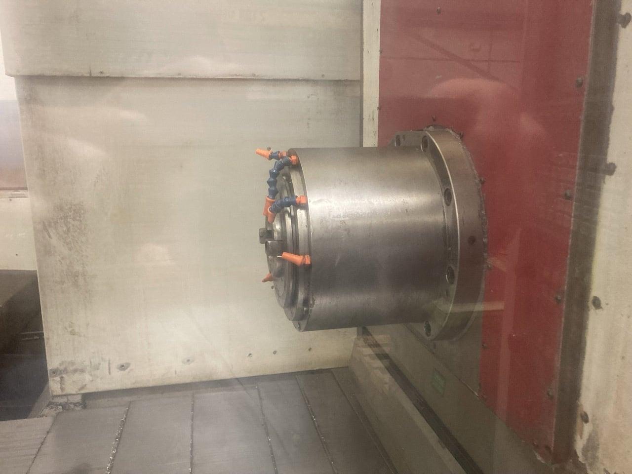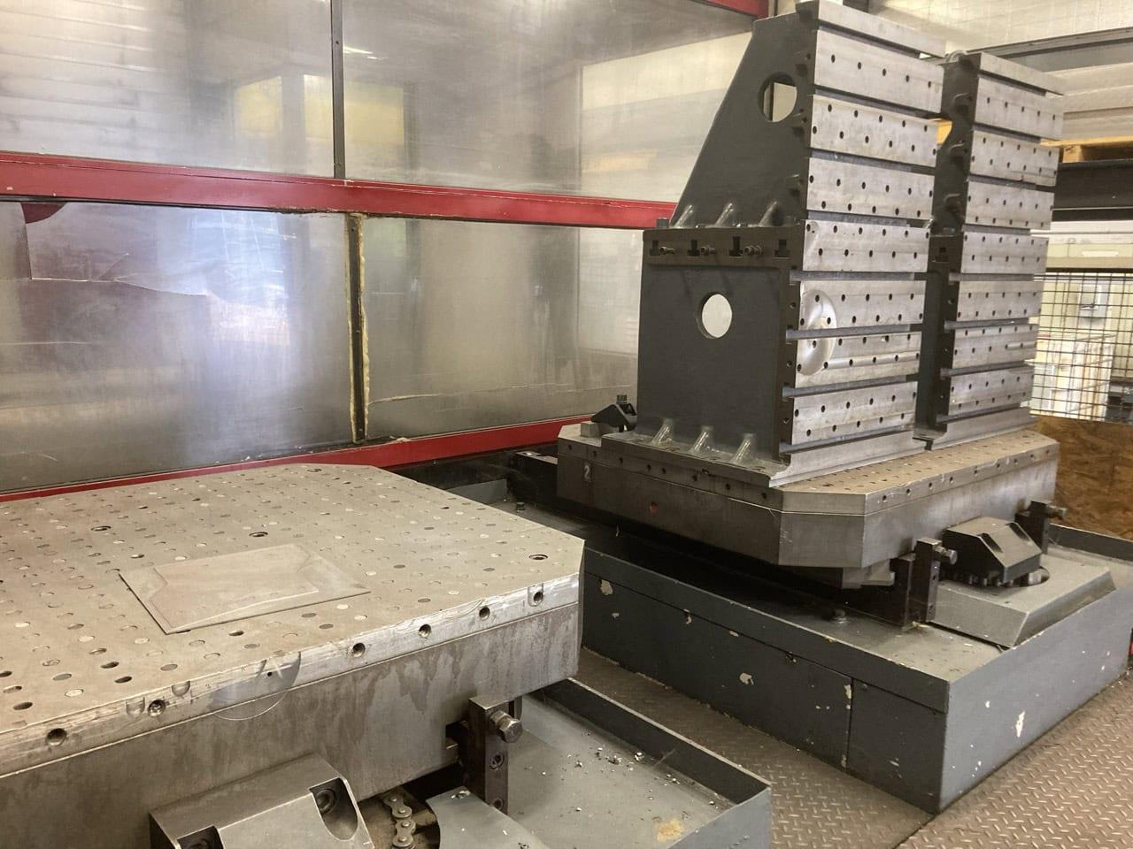 All specifications are assumed to be correct but must be confirmed by the purchasing entity.,Working Range Data • X axis Travel: 1840 mm (72”) • Y axis Travel: 1200 mm (47”) • Z axis Travel: 1270 mm (59”) • Distance between Horizontal Spindle Center & Upper Pallet Edge: 20 mm to 1220 mm (0.8” to 48”) • Distance between Front Edge of Horizontal Spindle & Center of Pallet (with Pallet @ 0°): 290 mm to 1540 mm (11.4” to 60.6”) • Interfering Circle Diameter in Work Area & At Clamping Station: 1800 mm (70.9”) • Workpiece Height within Interfering Circle: 1550 mm (61”) All specifications are assumed to be correct but must be confirmed by the purchasing entity.,Work Area Data • Min. Height of Workpiece Clamping Surface Above Floor Level @ Clamping Station: 1240 mm (48.8”) • Max. Height of Workpiece Clamping Surface Above Floor Level @ Clamping Station: 1270 mm (50”) All specifications are assumed to be correct but must be confirmed by the purchasing entity.,Spindle Data • Front Bearing Diameter: 170 mm (6.7”) • Tool Receiving Socket: DIN 2079 – 50 • Short Taper Shank: Short Taper DIN 69871 – A 50 with Draw-bolt DIN 69872 – 28 -or- Short Taper DIN 69871 – B 50 with Draw-bolt DIN 69872 – B 28 • Max. Speed: 4000 RPM • Main Gearing: Two Speed • Spindle Alignment: Electronic • Max. Torque on Spindle (w/ Extended Quill) @ 22 kW Rated Power & 100% On-Time: 1040 Nm (767 ft-lbs.) • Torque on Spindle (w/ Extended Quill) @ 22 kW Rated Power & 60% On-Time: 1370 Nm (1010 ft-lbs.) All specifications are assumed to be correct but must be confirmed by the purchasing entity.,X, Y & Z Axes Linear Feed Data • Constant Feed Force: 18 kN (4047 lbs.) • Max. Technologically Useful Feed Force: 20 kN (4496 lbs.) • Max. Machining Feed, Rapid Traverse: 24 m/min (945 ipm) • Measuring Systems: Linear, Optical-Incremental • Accuracy Class: +/- 5 μm (+/- 0.0002”) • Division of Grating: 20 μm (0.0008”) • Input & Indicating Fineness: 1 μm (0.00004”) • Safety Device: Y Axis Safety Brake • Hydraulic Weight Balancing: in Y Axis All specifications are assumed to be correct but must be confirmed by the purchasing entity.,B Axis Indexing/Rotary Table Data • Max. Indexing Speed: 6 RPM • Indexing Divisions: 360° x 1 • Max. Rotary Speed: 8 RPM All specifications are assumed to be correct but must be confirmed by the purchasing entity.,• Rotary Tangential Moment in Locked Condition: 26000 Nm (19177 ft- lbs.) All specifications are assumed to be correct but must be confirmed by the purchasing entity.,• Rotary Tangential Moment During Machining: 5400 Nm (3983 ft-lbs.) All specifications are assumed to be correct but must be confirmed by the purchasing entity.,• Rotary Input and Fineness: 0.001° All specifications are assumed to be correct but must be confirmed by the purchasing entity.,Chain Type Tool Magazine Data • Number of Storage Locations: 80 • Max. Tooling Diameter w/ Completely Filled Magazine: 125 mm (4.92”) • Max. Tooling Diameter w/Free Adjacent Locations: 250 mm (9.84”) • Max. Diameter of Bridge Type Tools: 500 mm (19.69”) • Max. Tool Length: 600 mm (23.62”) • Max. Tool Weight: 35 kg (77.2 lbs.) • Max. Permissible Total Weight of Tools in Magazine: 800 kg (1764 lbs.) • Chain Speed: 24 m/min (945 ipm) • Tool Change Time (for up to 15 kg tool weight) = 14 sec All specifications are assumed to be correct but must be confirmed by the purchasing entity.,Accuracy Data • Backlash on Reversal, Umax: 0.008 mm (0.0003”) • Indexing Accuracy of Indexing Table: +/- 3 seconds • Indexing Accuracy of Rotary Table: +/- 6 seconds All specifications are assumed to be correct but must be confirmed by the purchasing entity.,Coolant System Data • Tank Capacity: 1000 l (264 gal) • Coolant Supply Pressure Through Nozzles: 2 bar (29.4 psi) • Coolant Supply Volume Through Nozzles: 50 l/min (13.2 gpm) • Coolant Supply Pressure Through Center of Spindle: 30 bar (441 psi) • Coolant Supply Volume Through Center of Spindle: 30 l/min (7.9 gpm) All specifications are assumed to be correct but must be confirmed by the purchasing entity.,Space Requirements & Weight Data • Base Machine Weight as Erected: 25200 kg (55556 lbs.) • Total Weight Scope of Delivery: 32200 kg (70989 lbs.) • Overall Length: 8525 mm (335.6”) • Overall Width: 6350 (250”) • Machine Height (From Upper Edge of Foundation): 4070 mm (160.2”) • Erection Height: 4200 mm (165.3”) All specifications are assumed to be correct but must be confirmed by the purchasing entity.,Equipped With: – Fanuc Series 16-M CNC Control – Two (2) 1250 mm Pallets – B Axis Indexing/Rotary Table – Smog Hog Air Cleaner All specifications are assumed to be correct but must be confirmed by the purchasing entity. |