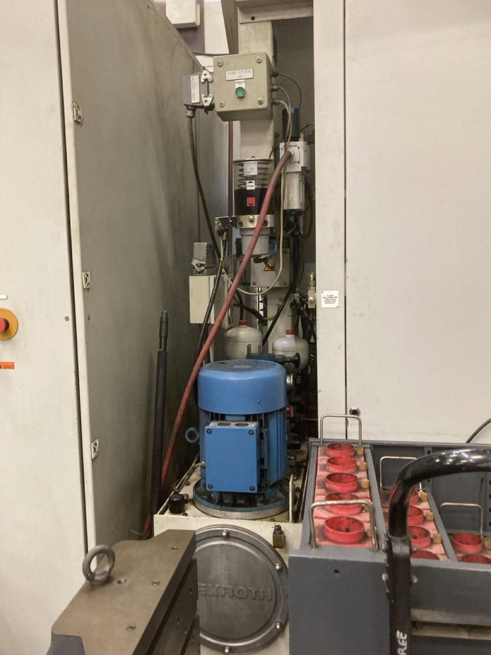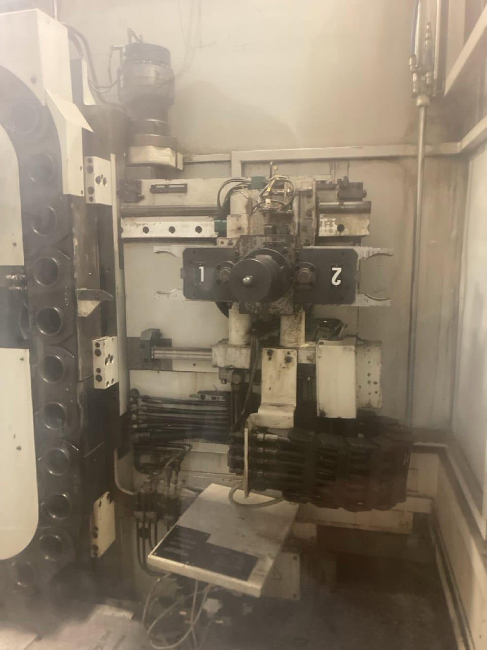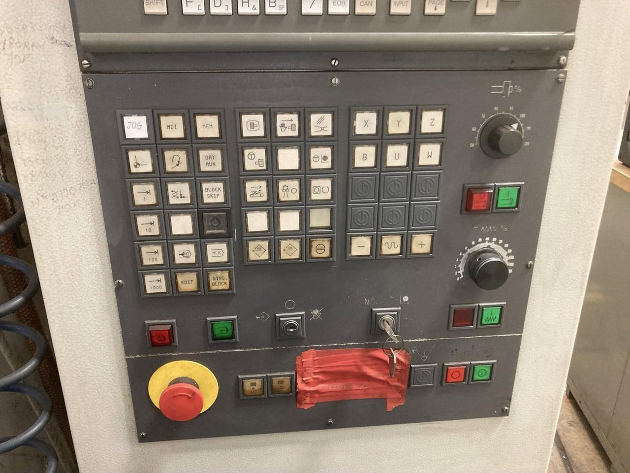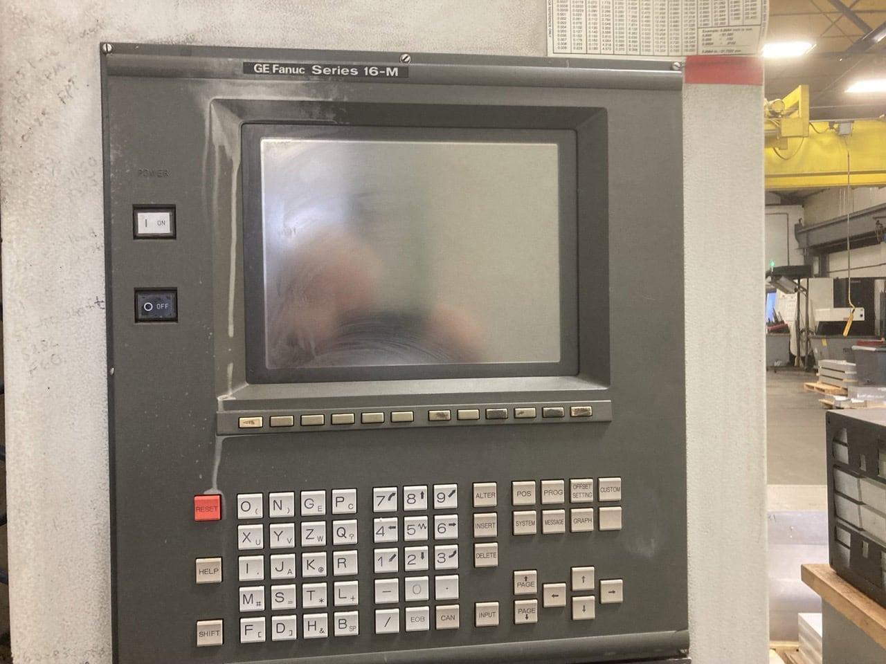 All specifications are assumed to be correct but must be confirmed by the purchasing entity.,Working Range Data • X axis Travel: 1840 mm (72”) • Y axis Travel: 1200 mm (47”) • Z axis Travel: 1270 mm (59”) • Distance between Horizontal Spindle Center & Upper Pallet Edge: 20 mm to 1220 mm (0.8” to 48”) • Distance between Front Edge of Horizontal Spindle & Center of Pallet (with Pallet @ 0°): 290 mm to 1540 mm (11.4” to 60.6”) • Interfering Circle Diameter in Work Area & At Clamping Station: 1800 mm (70.9”) • Workpiece Height within Interfering Circle: 1550 mm (61”) All specifications are assumed to be correct but must be confirmed by the purchasing entity.,Work Area Data • Min. Height of Workpiece Clamping Surface Above Floor Level @ Clamping Station: 1240 mm (48.8”) • Max. Height of Workpiece Clamping Surface Above Floor Level @ Clamping Station: 1270 mm (50”) All specifications are assumed to be correct but must be confirmed by the purchasing entity.,Spindle Data • Front Bearing Diameter: 170 mm (6.7”) • Tool Receiving Socket: DIN 2079 – 50 • Short Taper Shank: Short Taper DIN 69871 – A 50 with Draw-bolt DIN 69872 – 28 -or- Short Taper DIN 69871 – B 50 with Draw-bolt DIN 69872 – B 28 • Max. Speed: 4000 RPM • Main Gearing: Two Speed • Spindle Alignment: Electronic • Max. Torque on Spindle (w/ Extended Quill) @ 22 kW Rated Power & 100% On-Time: 1040 Nm (767 ft-lbs.) • Torque on Spindle (w/ Extended Quill) @ 22 kW Rated Power & 60% On-Time: 1370 Nm (1010 ft-lbs.) All specifications are assumed to be correct but must be confirmed by the purchasing entity.,X, Y & Z Axes Linear Feed Data • Constant Feed Force: 18 kN (4047 lbs.) • Max. Technologically Useful Feed Force: 20 kN (4496 lbs.) • Max. Machining Feed, Rapid Traverse: 24 m/min (945 ipm) • Measuring Systems: Linear, Optical-Incremental • Accuracy Class: +/- 5 μm (+/- 0.0002”) • Division of Grating: 20 μm (0.0008”) • Input & Indicating Fineness: 1 μm (0.00004”) • Safety Device: Y Axis Safety Brake • Hydraulic Weight Balancing: in Y Axis All specifications are assumed to be correct but must be confirmed by the purchasing entity.,B Axis Indexing/Rotary Table Data • Max. Indexing Speed: 6 RPM • Indexing Divisions: 360° x 1 • Max. Rotary Speed: 8 RPM All specifications are assumed to be correct but must be confirmed by the purchasing entity.,• Rotary Tangential Moment in Locked Condition: 26000 Nm (19177 ft- lbs.) All specifications are assumed to be correct but must be confirmed by the purchasing entity.,• Rotary Tangential Moment During Machining: 5400 Nm (3983 ft-lbs.) All specifications are assumed to be correct but must be confirmed by the purchasing entity.,• Rotary Input and Fineness: 0.001° All specifications are assumed to be correct but must be confirmed by the purchasing entity.,Chain Type Tool Magazine Data • Number of Storage Locations: 80 • Max. Tooling Diameter w/ Completely Filled Magazine: 125 mm (4.92”) • Max. Tooling Diameter w/Free Adjacent Locations: 250 mm (9.84”) • Max. Diameter of Bridge Type Tools: 500 mm (19.69”) • Max. Tool Length: 600 mm (23.62”) • Max. Tool Weight: 35 kg (77.2 lbs.) • Max. Permissible Total Weight of Tools in Magazine: 800 kg (1764 lbs.) • Chain Speed: 24 m/min (945 ipm) • Tool Change Time (for up to 15 kg tool weight) = 14 sec All specifications are assumed to be correct but must be confirmed by the purchasing entity.,Accuracy Data • Backlash on Reversal, Umax: 0.008 mm (0.0003”) • Indexing Accuracy of Indexing Table: +/- 3 seconds • Indexing Accuracy of Rotary Table: +/- 6 seconds All specifications are assumed to be correct but must be confirmed by the purchasing entity.,Coolant System Data • Tank Capacity: 1000 l (264 gal) • Coolant Supply Pressure Through Nozzles: 2 bar (29.4 psi) • Coolant Supply Volume Through Nozzles: 50 l/min (13.2 gpm) • Coolant Supply Pressure Through Center of Spindle: 30 bar (441 psi) • Coolant Supply Volume Through Center of Spindle: 30 l/min (7.9 gpm) All specifications are assumed to be correct but must be confirmed by the purchasing entity.,Space Requirements & Weight Data • Base Machine Weight as Erected: 25200 kg (55556 lbs.) • Total Weight Scope of Delivery: 32200 kg (70989 lbs.) • Overall Length: 8525 mm (335.6”) • Overall Width: 6350 (250”) • Machine Height (From Upper Edge of Foundation): 4070 mm (160.2”) • Erection Height: 4200 mm (165.3”) All specifications are assumed to be correct but must be confirmed by the purchasing entity.,Equipped With: – Fanuc Series 16-M CNC Control – Two (2) 1250 mm Pallets – B Axis Indexing/Rotary Table – Smog Hog Air Cleaner All specifications are assumed to be correct but must be confirmed by the purchasing entity. |