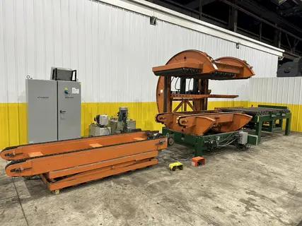 (3) Clamping cylinders Clamping Hydraulic Unit: 6-1/2 HP Upper feed roller driven Lower flat padded feed chains Passline Height is 42" Infeed conveyor transfers: (3) sections: (1) 200” x 37” wide