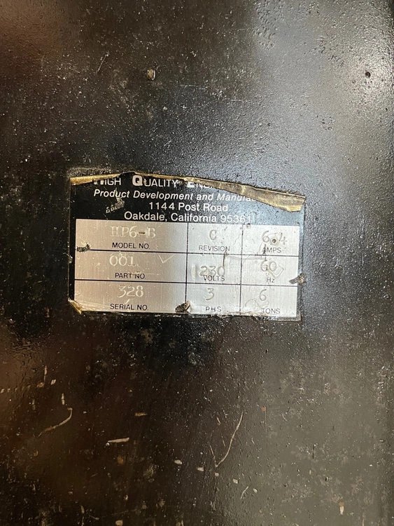 Reference # 6836 Model # HP6-B Serial # 328 Maximum force- 12,000 Lbs. (54 KN.) Electrical requirements- 3/60/230 volts Amperes- 5.2 Stroke length- 0 to 8-1/2" Vertical up stroke- 3/8" to 8-1/2" Throat depth- 18” Hydraulic oil capacity- 18 Gallons |