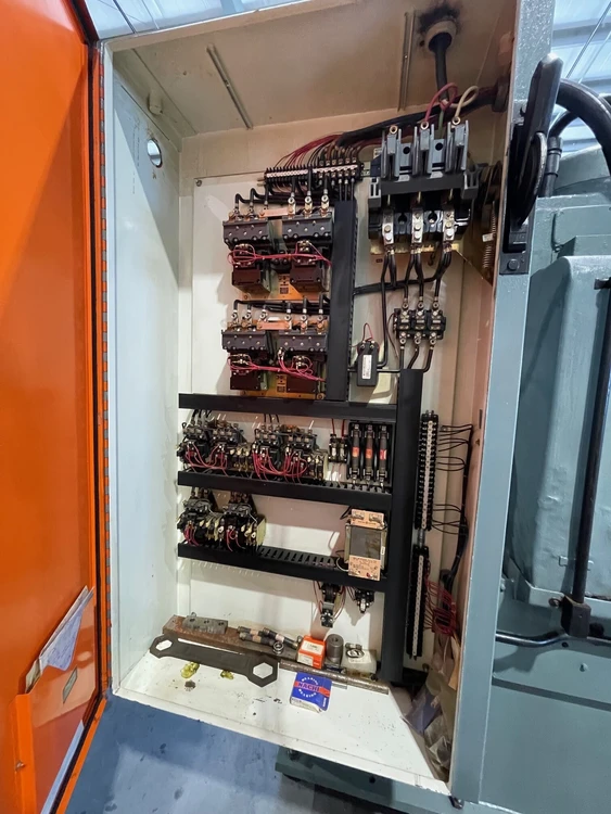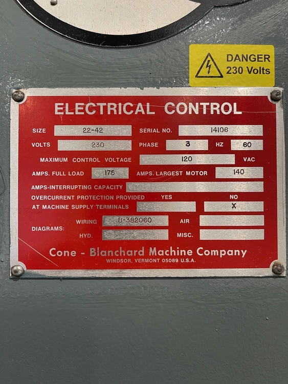 Reference #6945 Model # 22-42 Serial # 14106 Year of manufacture- 1974’ Chuck diameter- 42” Maximum swing inside splash guards- 48” Maximum load capacity on chuck- 3,000 Lbs. Vertical range under new grinding wheel- 24” (6) Table speeds- 6 – 33 R.P.M. Wheel speed- 720 R.P.M. Wheel diameter- 22” Infinitely variable power down feed- 0.004” - .080” Approximate remaining chuck life- .30” |