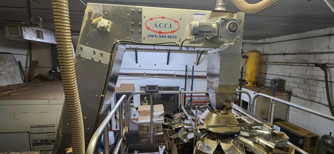 All specifications are assumed to be correct but must be confirmed by the purchasing entity.,– Packet Size Range: 6.25″-7″ W X 9.75″-11.5″ H with 3″ Gusset – Speeds: Up to 100 p/min – Air Requirements: 65 CFM @ 100 PSI Clean Dry Air – Electrical Requirements: 208V, 3P, 60 Hz All specifications are assumed to be correct but must be confirmed by the purchasing entity.,Yamato ADW-514AHCC 14 Head Weighscale – Weight Range: 4g-500g – Max Speed: 120P/min – Electrical Requirements: 230V, 1P, 60Hz All specifications are assumed to be correct but must be confirmed by the purchasing entity.,A.C.C.I. BFC71916 Bucket Elevator, 2016 – Conveyor at Hopper: 30″ Wide Belt with 1″ flights on 12″ Centers – Conveyor at Discharge: 12″ Wide Belt with 1.5″-2″ Flights on 12″ Centers All specifications are assumed to be correct but must be confirmed by the purchasing entity.,Mezzanine All specifications are assumed to be correct but must be confirmed by the purchasing entity.,-System Total Dimensions: 276.6″ x 100.7″ x 150.6″ Drawings Available On Request All specifications are assumed to be correct but must be confirmed by the purchasing entity. |