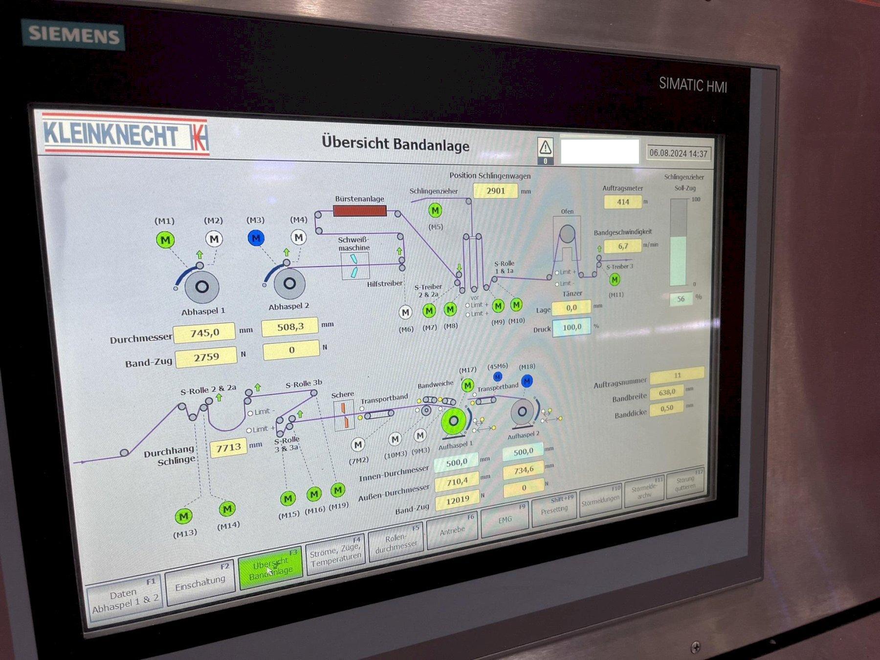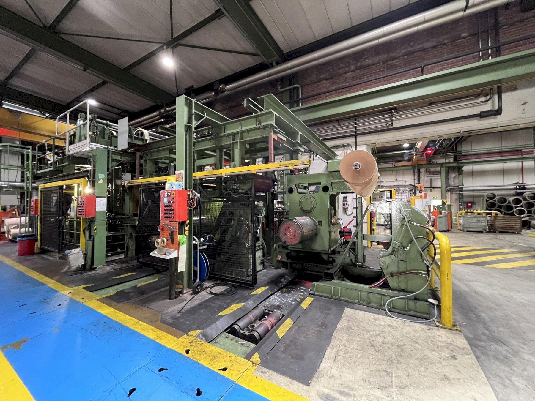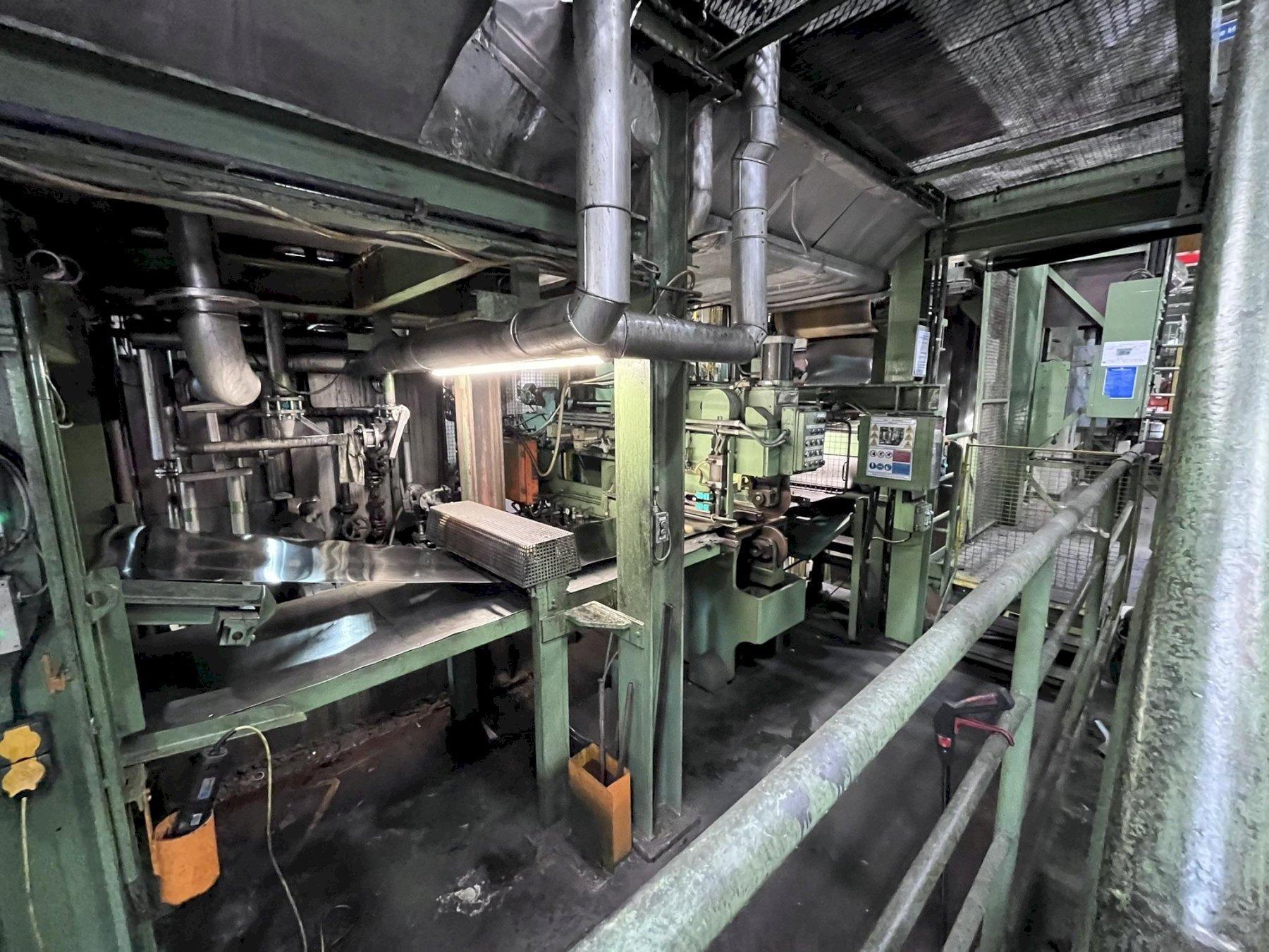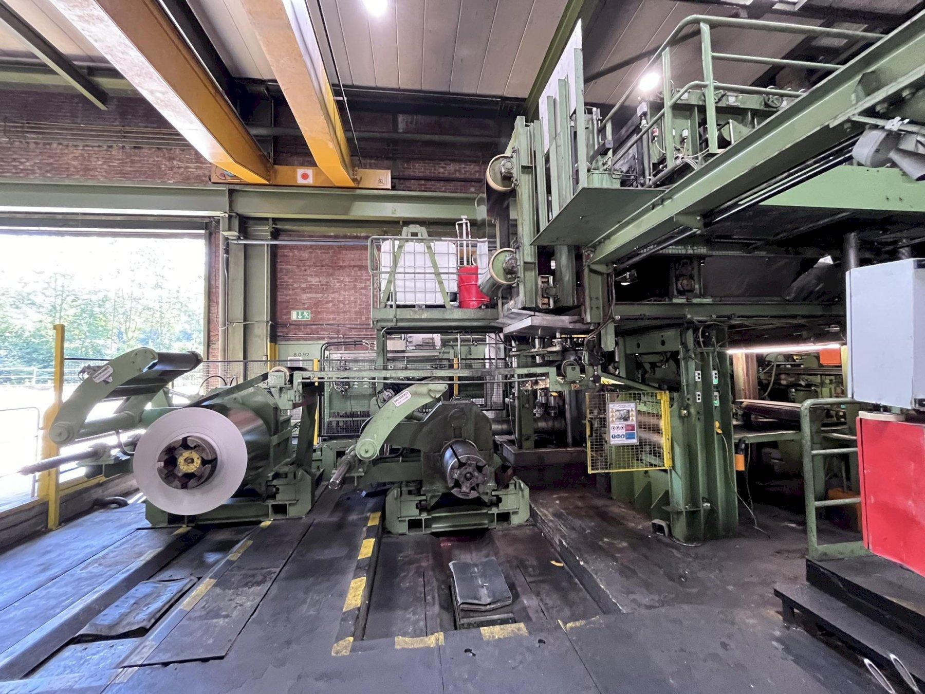 LINE CONFIGURATION ENTRY DOUBLE UNCOILER, MANDREL TYPE MANDREL………………..400/500mm HYFRAULIC EXPANSION SNUBBER COIL CARS HYDRAULIC CENTERING, PAPER WINDER WELDER PINCH ROLLS BRUSH (5) & WASH CLEANING DRYING UNIT DRIVER/BRIDLE ROLL VERTICAL ACCUMULATOR DRIVER/BRIDLE ROLL EBNER FURNACE, MUFFLE TYPE 100% HYDROGEN ATMOSFERE DRIVER/TENSIONER ROLLS VETICAL ACCULULATOR BRIDLE ROLLS CROP SHEAR CONVEYOR BELTS DOUBLE RECOILERS COIL ID……….. 500MM COIL OD ……… 1300MM BELT WRAPPERS COIL CARS OPERTOR CONTROL PANELS FLOOR SPACE ………….43.5 M X 8M INSTALLED, IN PRODUCTION UNTIL DEC, 2024.