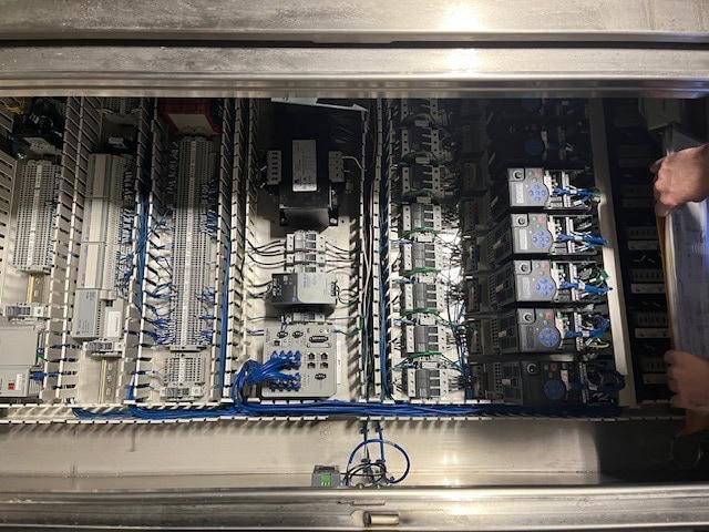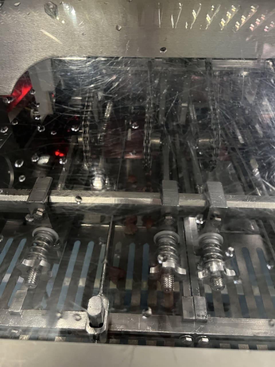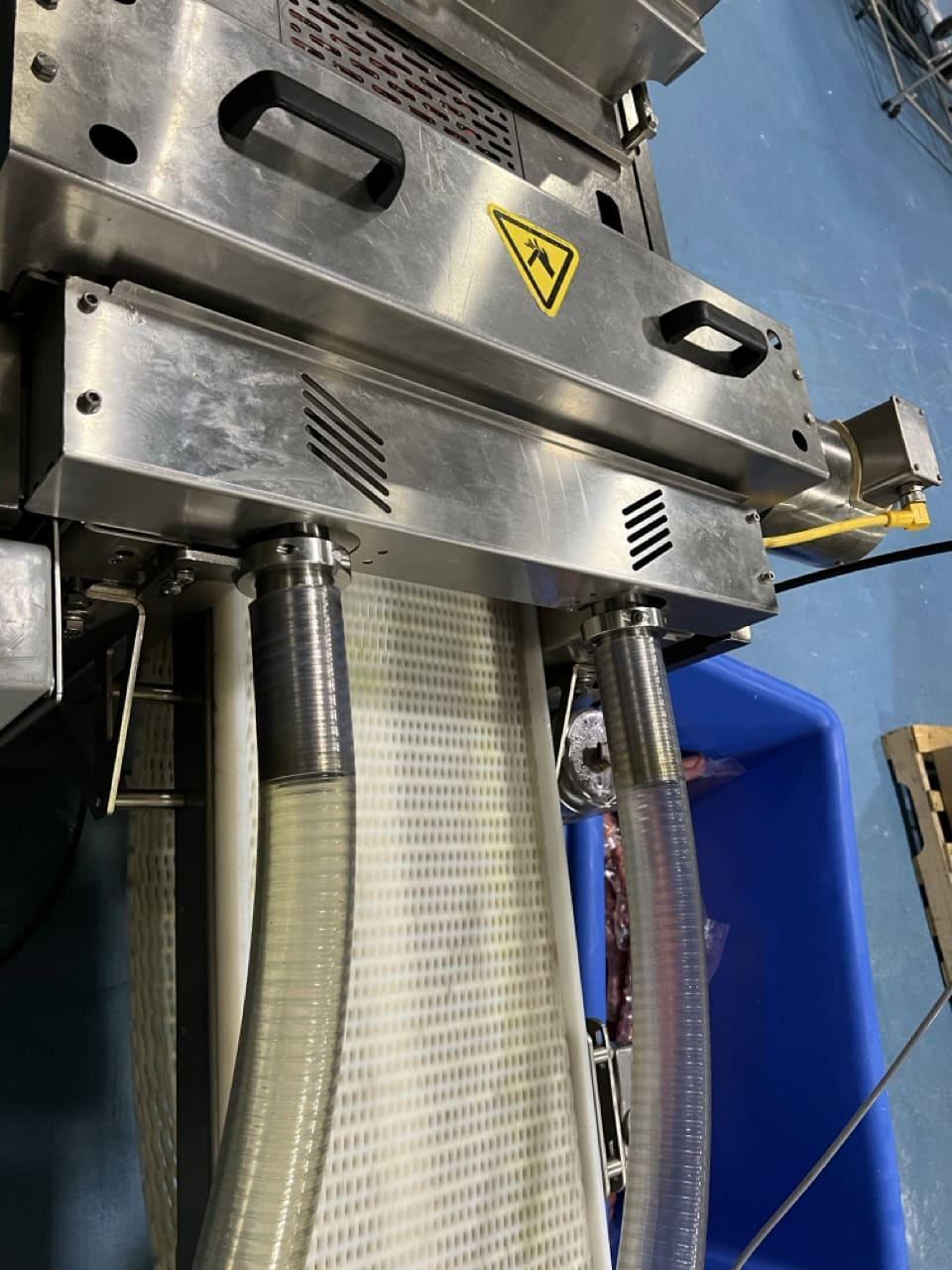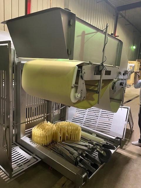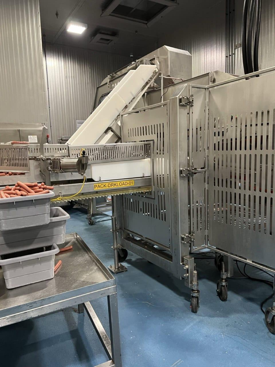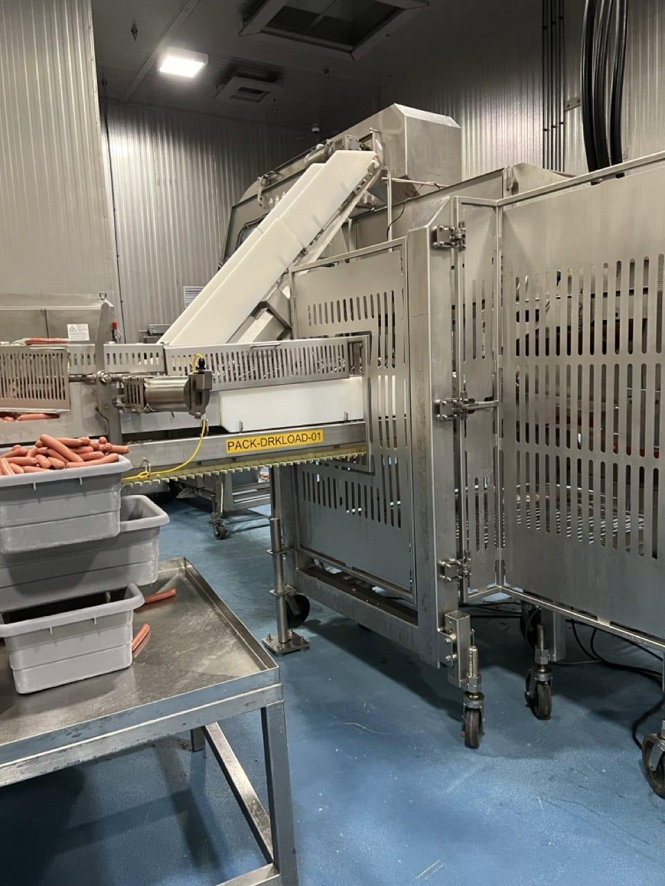 All specifications are assumed to be correct but must be confirmed by the purchasing entity.,Previous Use Hot Dogs All specifications are assumed to be correct but must be confirmed by the purchasing entity.,Model: LS-1400 with SWP Head Bucket Chain Width: 9 in Bucket Chain Pitch: 1-3/8 in All specifications are assumed to be correct but must be confirmed by the purchasing entity.,Water Requirements (for cleanup): Temperature: 140° F (60° C) Hardness: 60 to 120 ppm Quantity: 18 gpm (4.0 m3 /hour) All specifications are assumed to be correct but must be confirmed by the purchasing entity.,Approximate Weight of Assemblies Hopper 2500 lbs (1136 kg) Unscrambler 850 lbs (387 kg) Intermediate Conveyor, Excess Conveyor and Loading Head 3500 lbs (1590 kg) All specifications are assumed to be correct but must be confirmed by the purchasing entity.,Operating Temperature Range 32 deg F (0 deg C) to 50 deg F (10 deg C) Storage Temperature Range 32 deg F (0 deg C) to 120 deg F (49 deg C) All specifications are assumed to be correct but must be confirmed by the purchasing entity.,Packaging Machine Manufacturer: RapidPak Model: RP45 Confirmation Station: Yes Plug Assist: No IN-line or 90-Degree Interface: 90-Degree All specifications are assumed to be correct but must be confirmed by the purchasing entity.,Supply Voltage: 440 VAC, 3 Phase, 50/60 HZ All specifications are assumed to be correct but must be confirmed by the purchasing entity. |