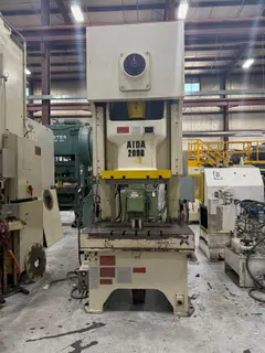 Aida Press Model NC1-2000 (2) E Single Point Mechanical Metal Stamping OBS Press 200 ton Metric Capacity 220 ton US Capacity 9.84" Stroke 24.8" Shut Height over Bed 17.72" Die Height over Bolster 4.3" Motorized Adjustment 54.7" LR x 33.1" FB Bed Area 34.6" LR x 25.6" FB Slide Area 25-50 VSPM Equipment and Features Wet Clutch and Brake Air Counterbalances Recirculating Lube System Vibro Floor Mounts T-Slotted Ram and Bolster Hydraulic Overloads 20 HP Main Drive Motor Motors and Controls This used 200 metric ton Aida Press can be seen under power in the S&G Press Livonia Michigan Warehouse upon request!