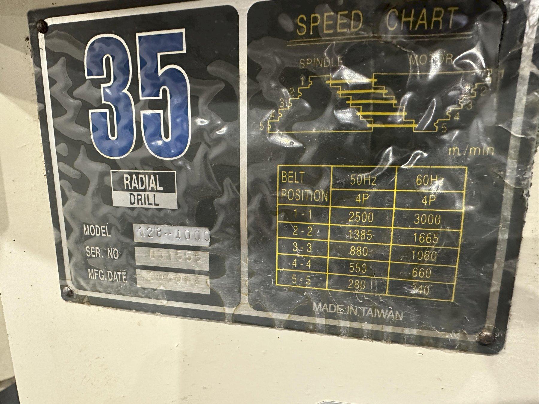 SERIAL .. 031555 MODEL .. 128-4000 YEAR .. 2002 SPINDLE SPEEDS .. 280 TO 3000 RPM ARM LENGTH .. 3' COLLUMN DIAMETER .. 4-1/2" BASE .. 22" X 19" UNDER DRILL .. 3" X 21" |