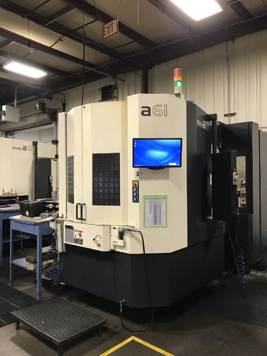 OverviewDescriptionMakino A61 4-Axis HMC, 2005, 19.7" Pallets, 28.7"x25.6"x28.7" Travels, 12K RPM, CT40, Makino Pro 3 Ctrl, Renishaw Probe, Coolant, 60 ATC, Full 4th Axis Makino A61 4-Axis CNC Horizontal Machining Center - 2 Available! New: 2005 Specifications: Pallet Size: 19.7" x 19.7" Tapped Travels: X-Axis: 28.7" Y-Axis: 25.6" Z-Axis: 28.7" Spindle Nose to Pallet Center: 2.76" - 31.5" Spindle Center to Pallet: 3.15" - 28.74" Number of Pallets: 2 Pallet Change Time: 8 Seconds Max Payload: 500 kg Spindle Speed: 12,000 RPM Spindle Motor: 25 HP Continuous Spindle Taper: CAT 40