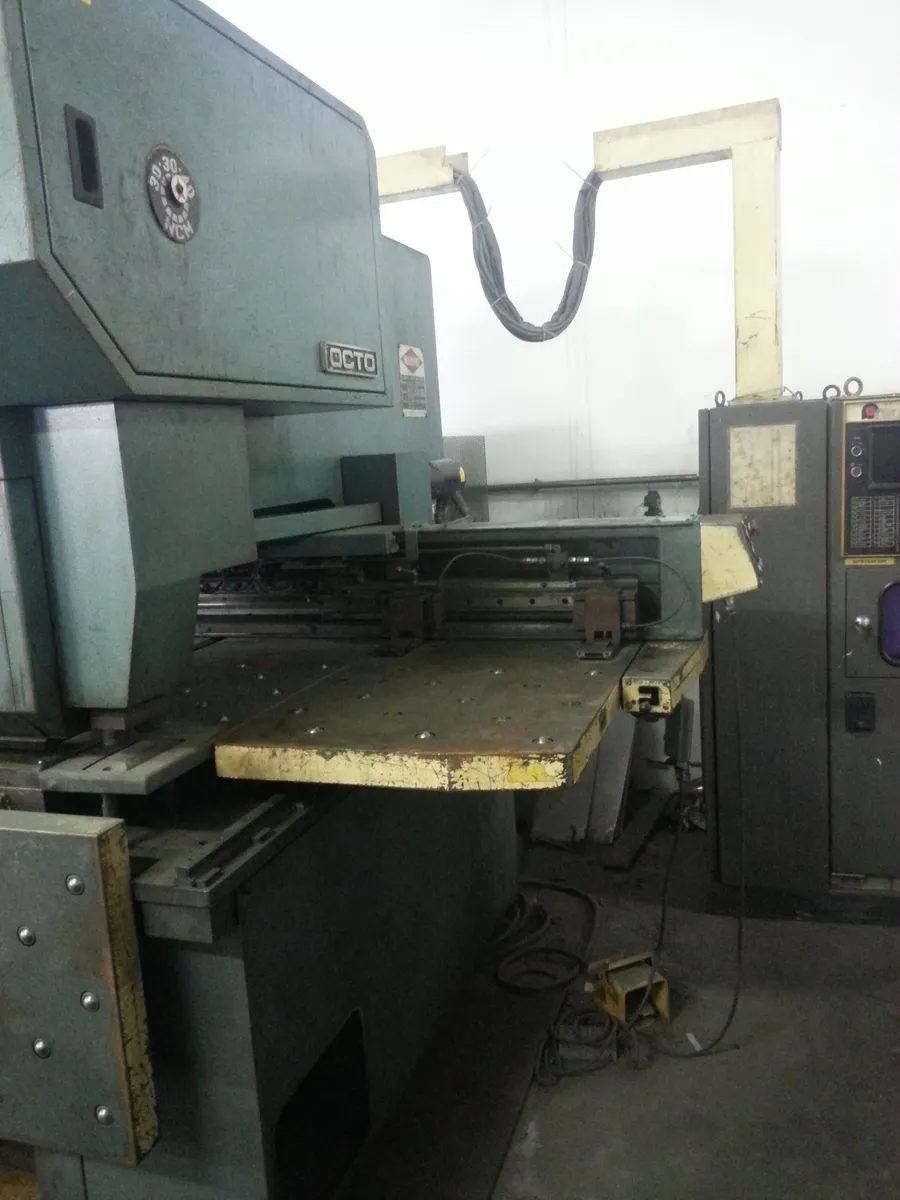 OverviewDescriptionAmada 30-30-40 Punch Press, Fanuc 0 System 6M, 33 Ton AMADA OCTO 30-30-40 PUNCH PRESS YEAR: MID 80'S SPECIFICATIONS: CAPACITY: 33 TON NUMBER OF STATIONS: 9 (THICK-W/ONE AUTO INDEX) MAXIMUM TRAVERSE: 29.928" X 39.37" MAXIMUM SHEET WITH REPOSITIONING: 29.928" X 78.740" MAXIMUM SHEET WITH APPROPRIATE SUPPORT TABLES.60" X 120" (HAS REAR ADDRESS CLAMPS) MAXIMUM SHEET THICKNESS: 250" PRESS STROKE: 300 S.P.M. HITS PER MINUTE (ON 1" CENTERS): 150 FEED SPEED: 1,575. I.P.M. DIMENSIONS: 94.84" (W) X 120.67" (L) X 87.48" (H) WEIGHT: 20,000 LBS. EQUIPPED WITH: ONE (1) AUTO INDEX STATION FANUC SYSTEM 6M CNC CONTROL LOTS OF TOOLING & SHARPENERS |