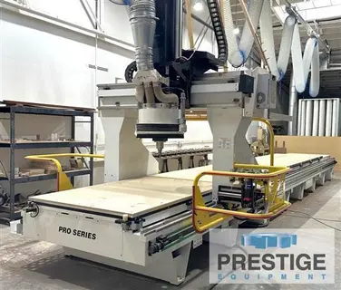Vacuum Table Dimensions 60" x 408" Spindle Speed 24,000 RPM X-Axis Travel 418.60" Y-Axis Travel 76.68" Z-Axis Travel 28" A-Axis Rotation +/- 120° C-Axis Rotation +300°/-115° Spindle Taper HSK-63F Distance Between Columns 64.99" Spindle Motor 24 HP Vacuum Pump 40 HP Equipped With: Fanuc 31-B5 CNC Control 5-Axis Spindle Head Dekker V-Max Liquid Ring 40HP Vacuum Pump 12-Station Automatic Tool Changer 60" x 408" Aluminum Vacuum Grid Table High Flow Vacuum Zone Pneumatic Controlled Reference Positioning Pin Renishaw RMP60 RF Touch Probe System Renishaw TS27R Wired Length & Diameter Tool Setter 24 HP Spindle Motor Spindle Chiller Fanuc MPG Handheld Remote Jog Pendant Factory Pre-Wire & Retrofit Kit Removable Dust Hood HOURS: 405 Spindle Hours |