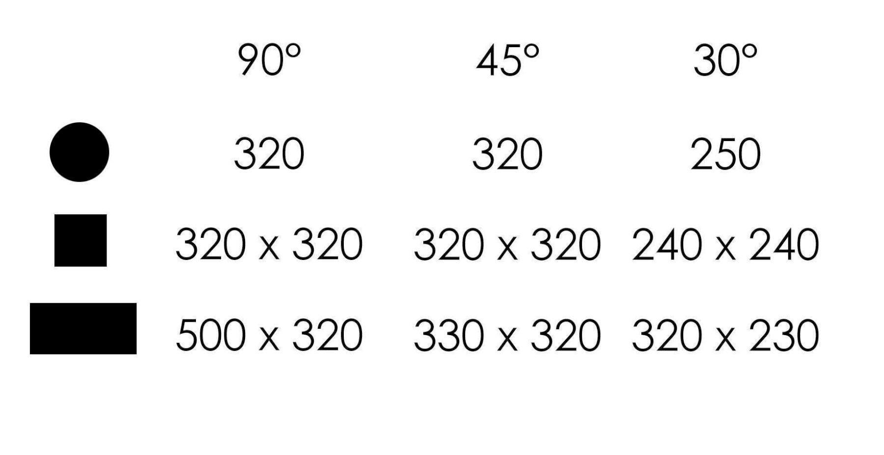 Square 90° and 45° - 320 x 320 mm / 30° - 240 x 240 mm