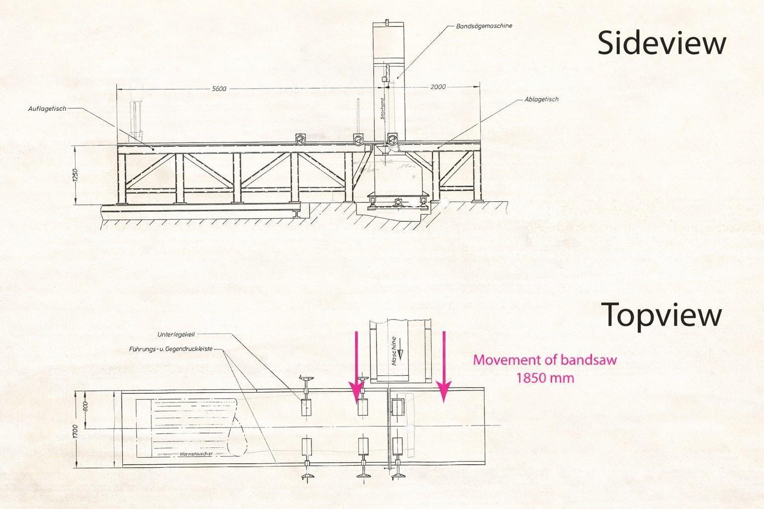 The bandsaw performs cutting with the blade rotated by 90°, moving transversely to the workpiece with a cutting stroke of 1,600 mm