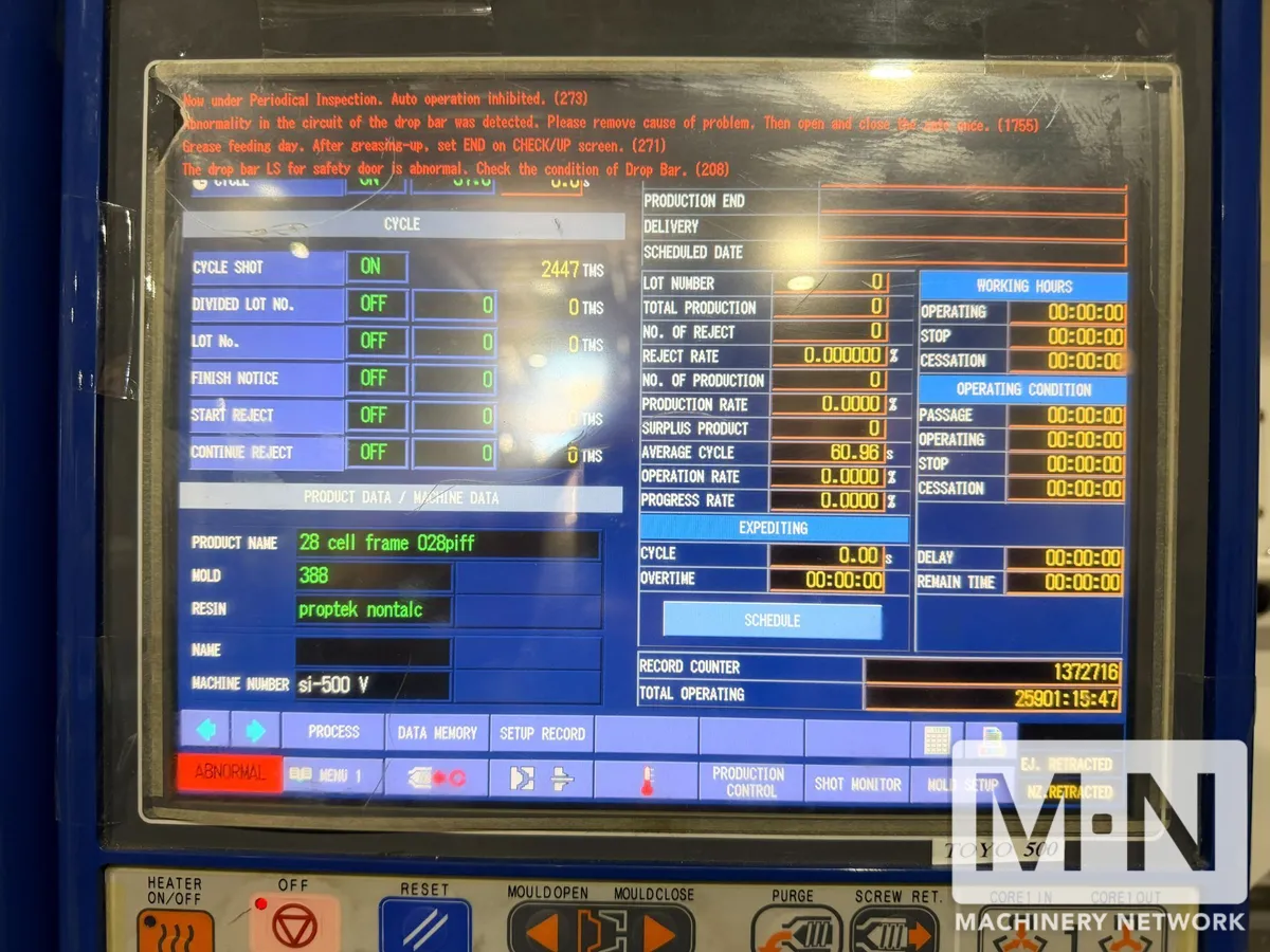 OverviewDescription500 TON 68 OZ TOYO MODEL Si-500V ELECTRIC INJECTION MOLDING MACHINE MFG 2012 ONLY APPROX 25,901 HOURS |
