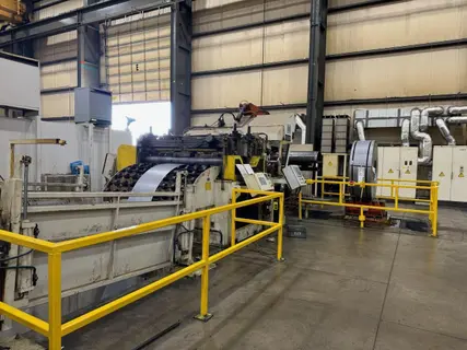 Coil weight capacity: 60,000 Lb Coil width capacity: 72" Stock thickness capacity: .125" x 72" Wide Expansion range: 22" - 26" Coil O.D. Capacity: 72" Sesco Conventional Complete Coil Feed Line Equipment and Features: Sesco Traveling Coil Reel and Traveling Coil Load Car Traversing coil reel base Three leaf mandrel with coil keeper arms Hydraulic mandrel expansion Air brake mounted on main spindle Adjustable tensioning Threading drive for jog forward and reverse Traversing coil load car Power lift and travel Narrow coil supports Coil storage rack Sesco Peeler, Threader, Hold Down Arm Station Stand alone PTH station Hydraulic hold down arm raise and lower Hydraulic hold down arm motorized end wheel Hydraulic peeler table raise and lower Hydraulic peeler table spade extension Sesco Powered Coil Straightener Entry and exit pinch roll assemblies x 6" diameter Air operated upper pinch roll adjustment Seven powered straightener rolls x 3" diameter Bank type upper straightening roll adjustments via screw jacks Adjustable stock width edge guides Dual flights of upper and lower straightener roll back ups Exit cascade loop support rollers Variable speed drive Operator's control station Auto / Run cycle Sesco Dual Exit threading Table Bomb bay door design Sesco Servo Roll Feed Air operated upper servo feed roll adjustment / pilot Entry side cascade material support section Self centering dual roll stock width edge guides Solenoid controlled pilot release Air pressure/regulator Cabinet base mounted w/ adjustable pass line height |