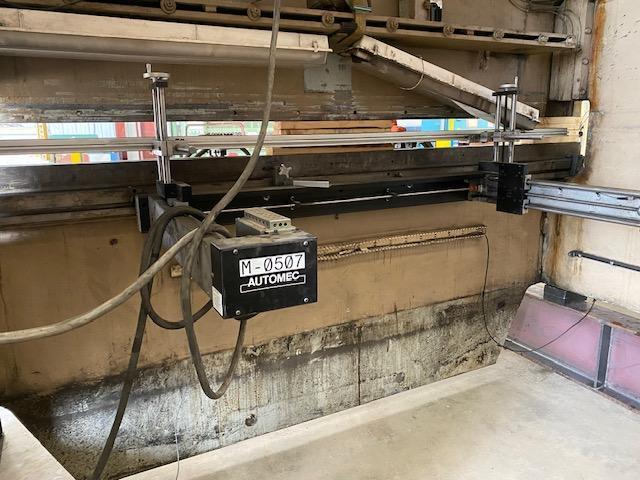 All specifications are assumed to be correct but must be confirmed by the purchasing entity.,10’6” between housings 3/8” x 10’ Mild Steel P.L. 11’6” LG All specifications are assumed to be correct but must be confirmed by the purchasing entity.,Pit Is Required, Drawings available 149” L-R x 96” F-B x 155” Tall AS It Sits on the I beams Approx 41,000 lbs All specifications are assumed to be correct but must be confirmed by the purchasing entity.,Automec Back Gauge, X Manual R axis All specifications are assumed to be correct but must be confirmed by the purchasing entity. |
