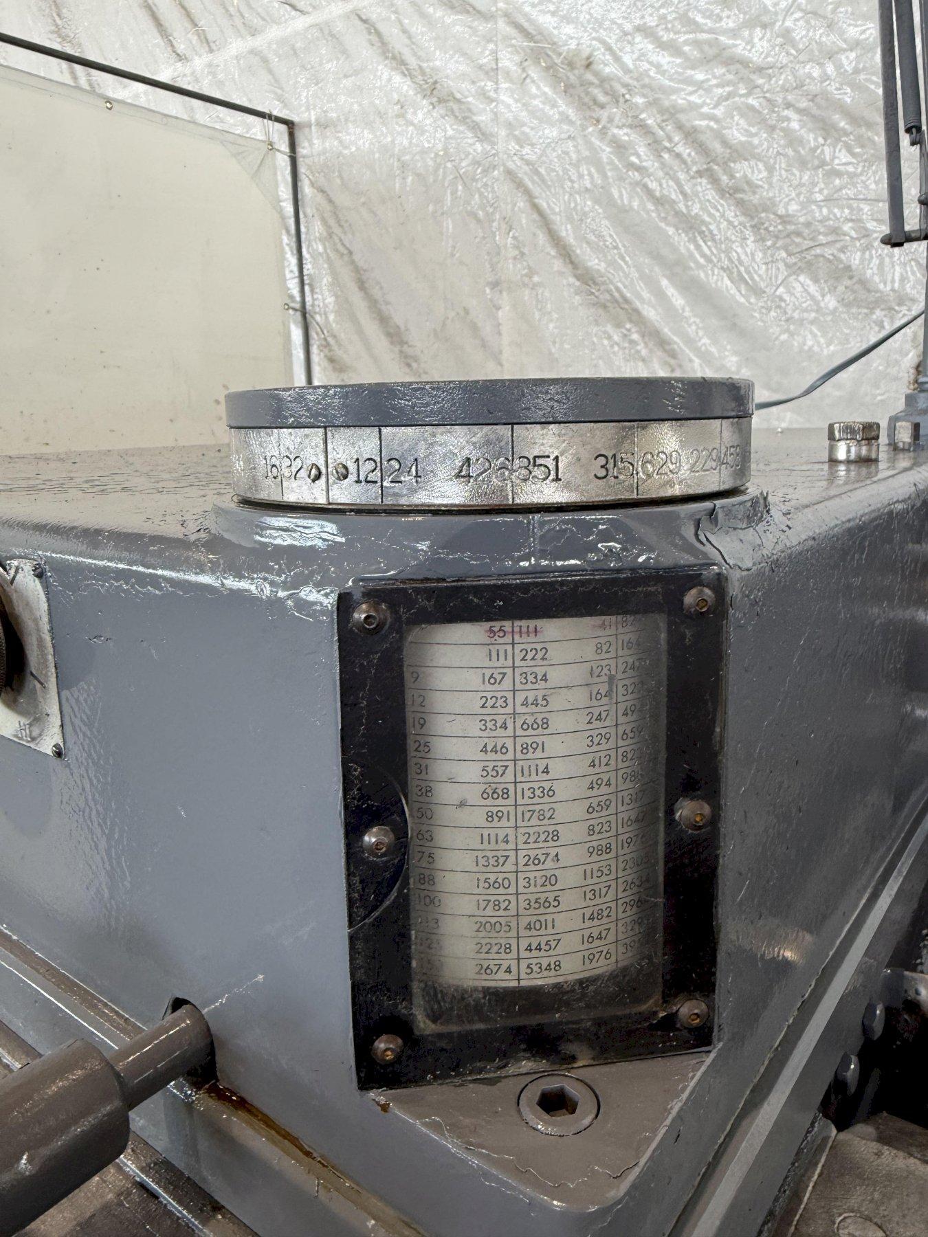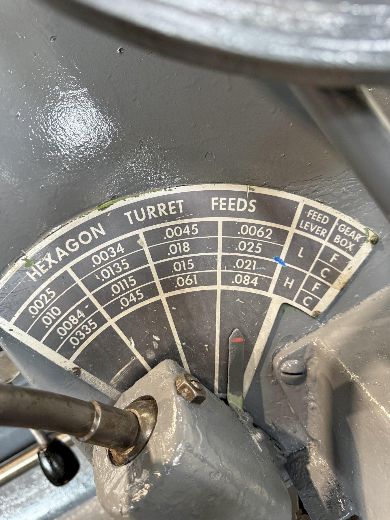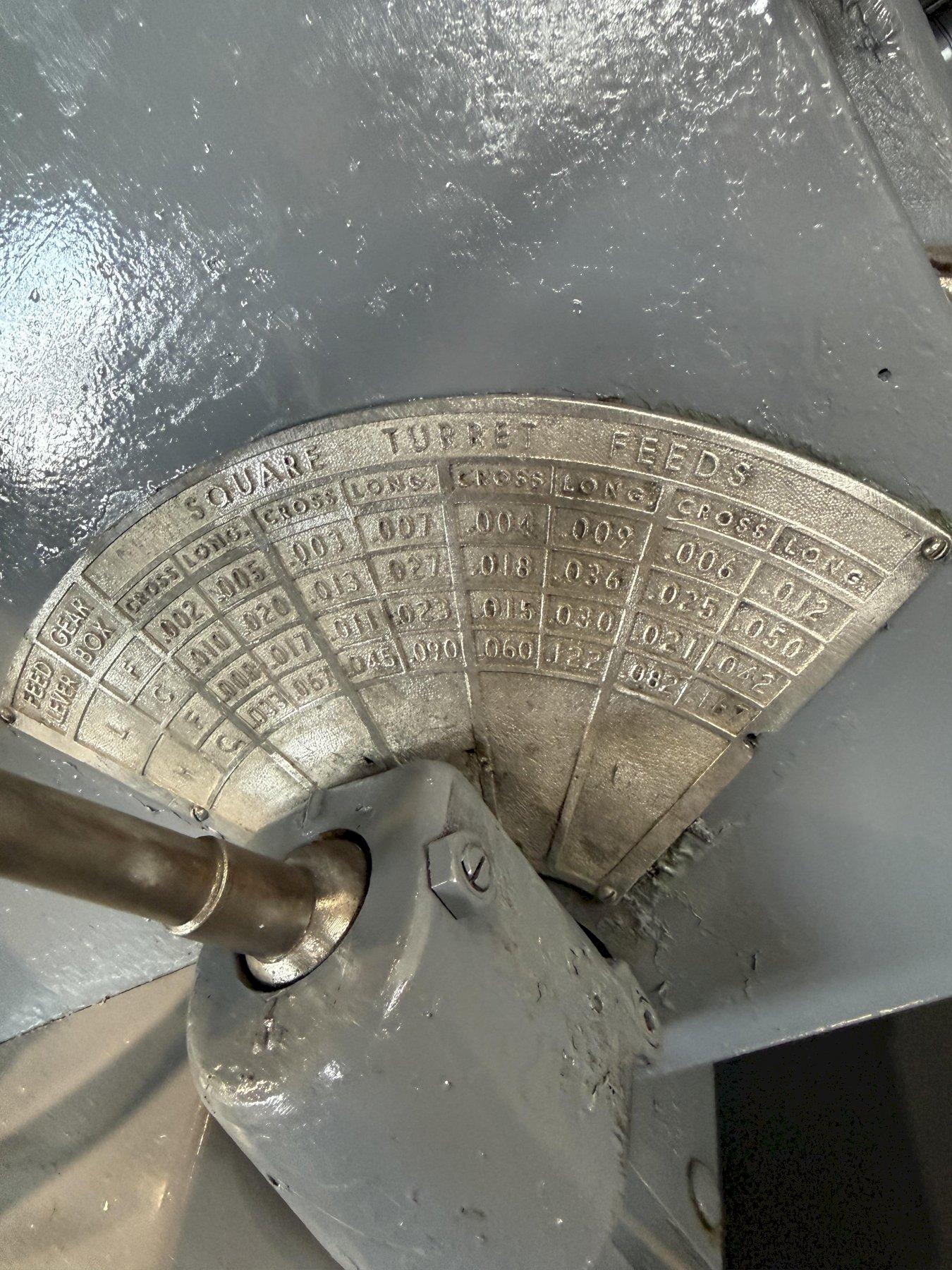 SERIAL ............................. 2183635 MODEL .............................. 3A (M-3500) SQUARE HEAD SWING OVER BED ..................... 24-1/2" SWING OVER CARRIAGE HORN ........... 18" SPINDLE NOSE TO TURRET ............. 58-3/4" SPINDLE HOLE ....................... 6-1/8" SPINDLE SPEEDS ..................... (32) 12 TO 851 RPM CHUCK .............................. 21" 3 JAW POWER CHUCK WRENCH .. YES CARRIAGE LONGITUDINAL FEEDS ........ (16) .005 TO .167 IPR CARRIAGE CROSS FEEDS ............... (16) .002 TO .082 IPR TURRET LONGITUDINAL FEEDS .......... (16) .005 TO .167 IPR ADJUSTABLE SLIDE TOOLS .. 2 FLANGE TOOL HOLDER .. 4 CHIP PAN WITH COOLANT .............. YES MAIN MOTOR ......................... 25 HORSEPOWER
