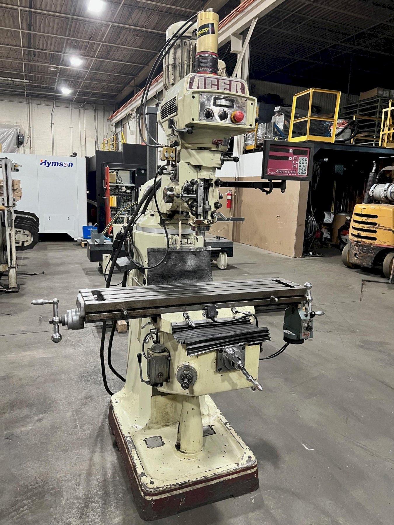 Model: E-Mill 3VS Specifications: Table size: 9" x 42" Longitudinal travel: 28" Cross travel: 12" Vertical knee travel: 16" Ram travel: 12" T-slot number, size: (3) 5/8" Head left to right: 90 degrees Head front to back: 45 degrees Spindle speed: 60 - 4,500 RPM (infinitely variable) Spindle taper: R8 Power quill feeds: 0.0015, 0.003, 0.006 in/rev Quill diameter: 3-3/8" Quill travel: 5" Voltage: 480 volt 3 phase Weight: 2,400 Lbs. Equipped with: X-axis power feed Power drawbar Newall DP500 2-axis readout Fan cooling system dissipates heat efficiently 3 HP spindle inverter motor One piece quill pinion & shaft |