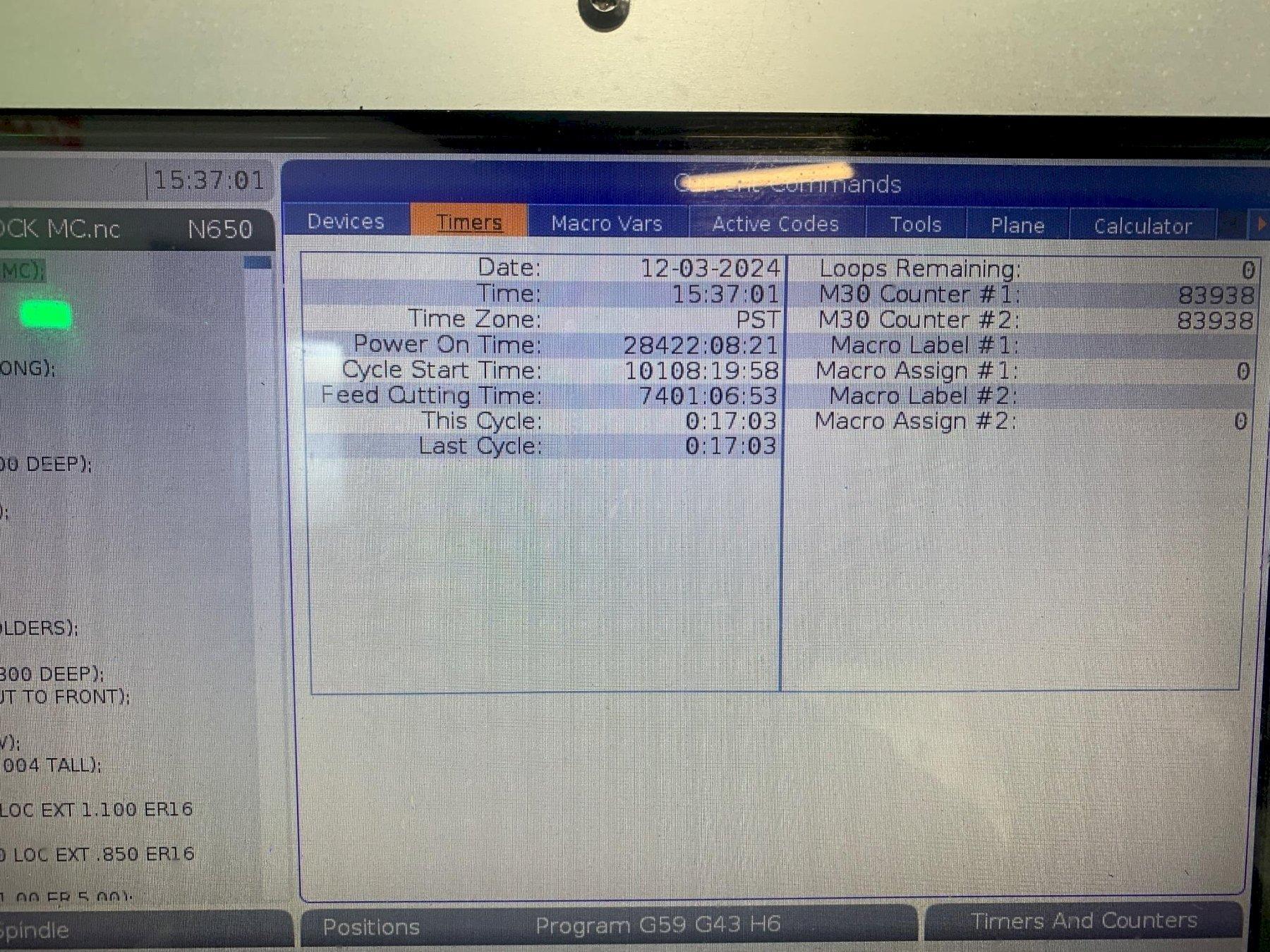 X 30" Y 16" Z 20" Power 30 hp RPM 12,000 RPM # ATC 24 Taper CT or BT 40 Table-W 14" Table-L 36" # Axis 4 Hours Power On: 28,422 Cycle Start: 10,108 Feed Cutting: 7,401 EQUIPPED WITH Multi Chip Auger WIPS High Speed Machining 4th Axis Ready 5th Axis Ready Programmable Coolant *Trunnion and Toolholders are NOT included in the sale. Buyer Is Responsible For Scheduling Transportation Of All Items, As Well As All Cost To Move It. We Can Provide You With Shipping And Rigging Quotes If You Need Help. Please Contact Us And We Will Assist You With Any Questions You May Have. All Items Are Are Sold "As Is, Where Is”. Specifications, Options, And Additional Accessories Are Quoted To The Best Of Our Knowledge And Are Subject To Buyer's Verification And Correction.