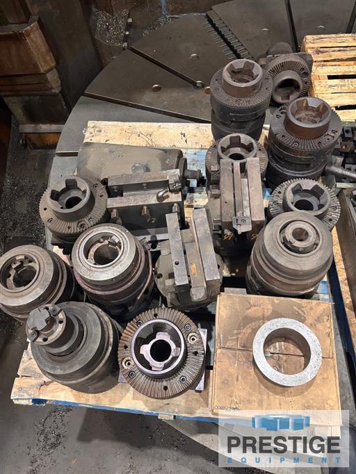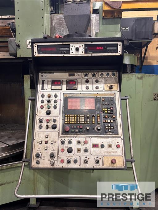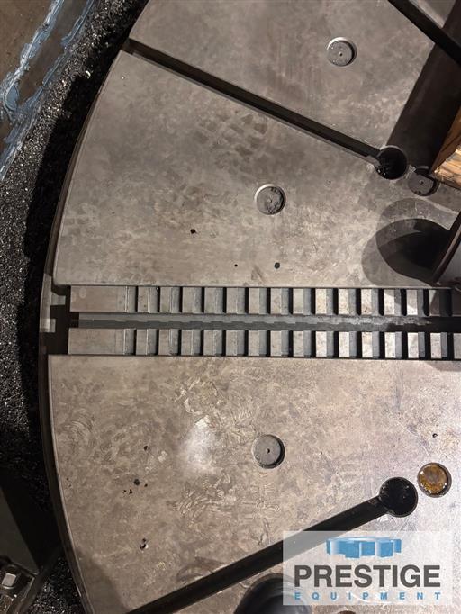 Table Diameter 98.45" Maximum Swing 118.11" Max Height Under Rail 88.58" Maximum Turning Height 78.74" Ram Stroke, Z-Axis 49.21" Ram Cross-Section 9.44" x 9.44" Table Speeds (2 Ranges) 2-123 RPM Table Motor 100 HP Table Indexing, C-Axis .001 degrees Milling Spindle Taper ISO #50 Milling Spindle Speeds 0-1000 RPM Milling Spindle Motor 24 HP Equipped With: Siemens Sinumerik System 8 CNC Controls 16-Station Automatic Tool Changer Hardened Replaceable Ways on Cross Rail Live Milling Spindle Right Angle Head C-Axis Table 100 HP Table Drive Motor |