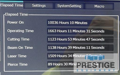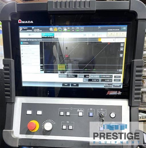 Maximum Laser Output 3 KW X-Axis Carriage Travel 121" Y-Axis Laser Head Travel 61" Z-Axis Laser Head Travel 3.93" Maximum Sheet Size 60" x 120" Max. Material Thickness, Mild 1" Max. Material Thickness, Stainless .5" Max. Material Thickness, Aluminum .5" Max. Positioning Speed, X & Y Axis 4,724 IPM Repeatability +/-0.0002" Max. Material Weight 2,000 Lbs Equipped With: Amada AMNC 3i CNC Control With Color LCD Touchscreen Dual Pallet Shuttle Tables Amada Ensis 3000 3KW Oscillator Automatic Nozzle Changer Clean Cut Feature Orion Chiller HOURS: Power On:10,036 Hours Operating Time: 1,663 Hours Cutting Time: 1,123 Hours NOTE: Inspect In Plant Under Power |