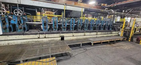 Maximum Coil Weight: 20,000 lbs. Line Speed: 30 to 150 FPM Line Direction: Right to Left Roll Space: 22" Tooling Shaft Dia. 3.5" Number of Stands: 16 Consisting of the following: -Bradbury Coil Car: 20,000 lb. Capacity Side Mast Type 0 - 28" Vertical Coil Lift Vertical Lift thru Hydraulic Cylinder Rotating Base -Bradbury Uncoiler: Model: SR-20 20,000 lb. Capacity 36" Maximum Coil Width 3 Segment Pumpkin Tooth Mandrel 72" Maximum Coil O.D. 18.50" - 24.50" Expansion Range Hydraulic Wedge Type Expansion Air Cooled Drag Brake (Single Caliper) Hydraulic Feedup Drive Sliding Base Overarm Holddown Roll -Bradbury Peeler/Feed Table: Hydraulic Powered Table Lift & Extension Pivot Mount Design -Bradbury 7 Roll Roller Straightener: Model: RS-46 (7) - 4" Diameter Work Rolls 24" Max. Material Width 0.164" Max. Material Thickness (Up to 70,000 PSI Steel) 6" Diameter Air Loaded Pinch Rolls -Bradbury Barrier Feed Table: Roll in Type 24" Maximum Material Width -Bradbury Rafted Rollformer: Series: AM400 Model: 425-22-16, Geared Head Entry Edge Guides 16 Rafted Forming Stands on an extended Base (61 Stands Total) 3.50" Diameter Spindles 6" to 14" Vertical Spindle Adjustment Range 21.50" Horizontal Center Distance 22" Roll Space 4 Roll Mill Tech Weld Box Speed: 30 - 150 FPM 150 HP DC Drive Equipped with Reverse, Jog and Dynamic Braking -Bradbury Rafted Sizing Unit Stand: (3) Sizing Stands mounted on a separate Base Rafted Turkshead Driven by 30 HP DC Motor Includes: -Complete "Extra Set" of Rafted Stands (Mill and Sizing Unit) -Hydraulic Scarfing System (Outside Only) -15' Long Cooling Trough with Spray Nozzles |
