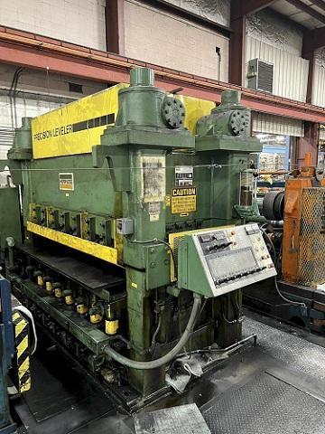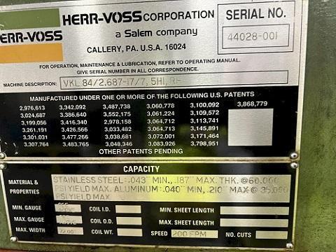 THICKNESS RANGE: .018" - .187" CARBON STAINLESS .018" - .125" ALUMINUM COIL WIDTH: 16" - 72" COIL WEIGHT: 25,000# SHEET LENGTH: 24" - 380" COMPLETE LINE WITH: 30,000# L-TYPE FLOOR STANDING COIL CAR MANDREL UNOILER 4 LEAF HYDRAULIC EXPANSION HYDRAULIC SLIDING BASE DC DRAG GENERATOR BRAKE FLOOR STANDING POWERED HOLD DOWN ROLL PEELER TABLE /PINCH ROLLS EDGE TRIMMER SCRAP CHOPPERS HERR VOSS 5HI PRECISION LEVELER MODEL VKL 84/2.687-17/7 5HI RH 7 FLIGHTS MOTORIZED BACK-UP ROLLS DIGITAL ROLL POSITIONING 150 HP DC DRIVE B&K PRECISION LEVELER 21 WORK ROLLS 1 3/4" DIA WORK ROILLS 78" ROLL FACE 60 HP DC DRIVE 5 FLIGHTS BACK UP ROLLS DIGITAL ROLL POSITIONING EXIT PINCH ROLLS RUN OUT BELT CONVEYOR 4 POST FLYING SHEAR MODEL: 5CTL SERIAL NO. 102 3" STROKE 200 SPM 22 1/4" SHUT HEIGHT RUN OUT TWIN BELT GAUGING TABLE L&M EQUIPMENT STACKER DROP TYPE PALLET LIFTING JACKS SHUTTLE CAR SIDE DISCHARGE TABLE OPERATOR PUSH BUTTON STATION MENTOR QUANTUM LLL DIGITAL DRIVES ALLEN BRADLEY PLC SPARE LEVELER ROLLS COMPLETE LINE WITH ELECTRICS, HYDRAULICS AND CONTROLS