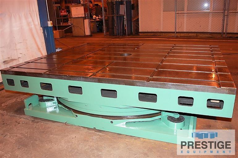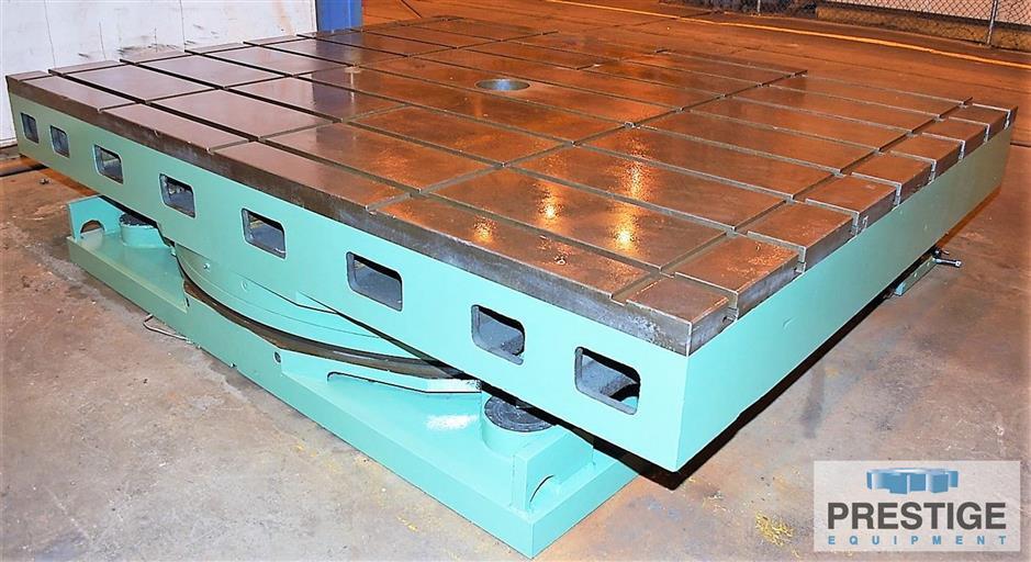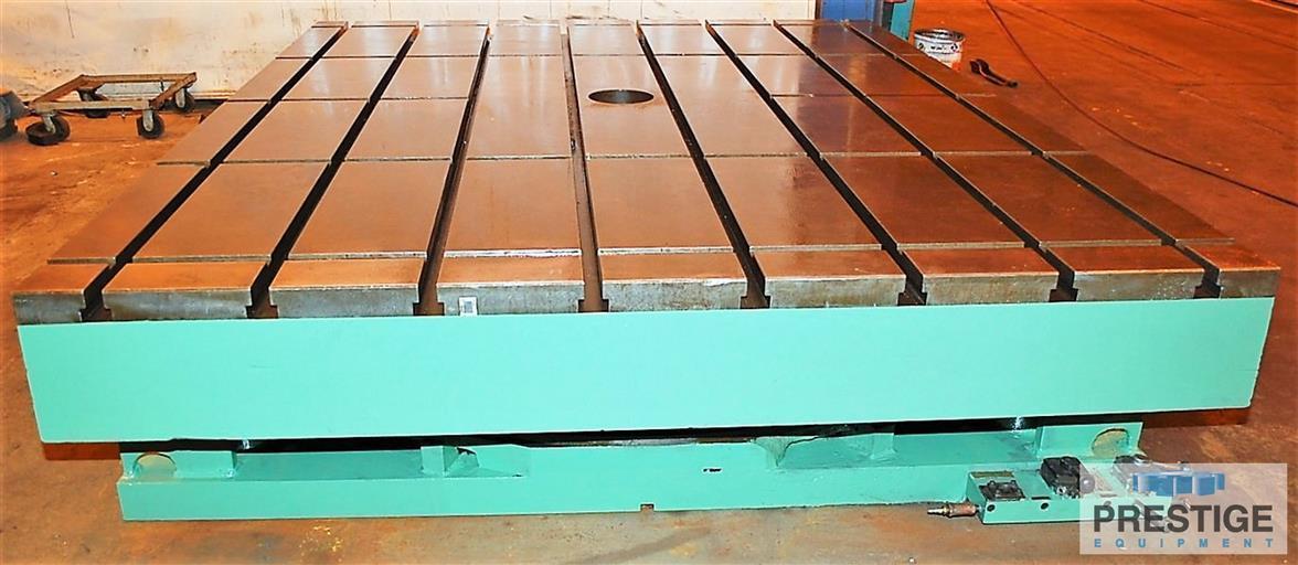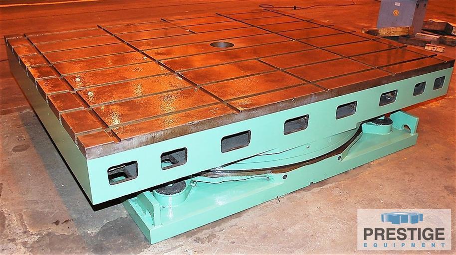 T-Slotted Table Surface 96" X 120" Table Height Overall 28" Number Of T-Slots 8 Width Of T-Slots, Top 1.25" Width Of T-Slots, Bottom 2.25" Depth Of T-Slots, Overall 2.5" Distance Between T-Slot Centers 12" Center Keyway Width 1 1/4" Cross Key Slots 5 Center Bore Diameter 8" Weight Capacity 75,000 LBS Shot Pin Locations (degrees) 90,180,270,360 Table Base Dimensions 120" x 96" Table Weight 39,000 lbs Equipped With: Air Clamp (4) Positive Stop, Shot Pins 360 Degree Scale with 1/2 Degree Increments Fixture Locating Keyway Centerbore In Table Platen NOTE: Not Operable |