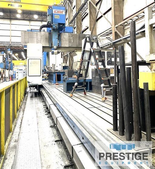 Gantry Travel, X-Axis 551" Head Travel, Y-Axis 135" Ram Stroke, Z-Axis 49" Height Under Rail w/ out Riser 68.7" Height Under Rail w/ Riser 104.4" C-Axis 0-360 degrees A-Axis +/- 110 Degrees Spindle Motor 50 HP (37 KW) Spindle Taper CAT 50 Table Size, T-Slotted 629" x 98" Distance Between Columns 120" Spindle Speeds, Max (2-Range) 3000 RPM Low Speed Range 0-899 RPM High Speed Range 900-3000 RPM Floor Space 629" x 98" Machine Height w/ Riser 243" Machine Height w/out Riser 207" Equipped With: Fanuc 15M-B CNC Control Traveling Gantry Design 2-Axis RM40 Head 629" x 98" T-Slotted Table Note: Inspect In Plant Under Power! Fixture/Riser tables in photos are not included |