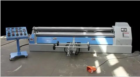 All specifications are assumed to be correct but must be confirmed by the purchasing entity.,Top Roll Diameter: 10″ nominal All specifications are assumed to be correct but must be confirmed by the purchasing entity.,Roll Material: Flame‑hardened/polished 1045 carbon steel, machined to ~63 µ″ finish All specifications are assumed to be correct but must be confirmed by the purchasing entity.,Drive System: Hydraulic LSHT motors; 2‑roll drive with hydraulic instant start/stop/reverse All specifications are assumed to be correct but must be confirmed by the purchasing entity.,Motor Power: 10 HP, TEFC, 230/460 V, 3‑phase All specifications are assumed to be correct but must be confirmed by the purchasing entity.,Roll Speed: Infinitely variable, 0–22 ft/min All specifications are assumed to be correct but must be confirmed by the purchasing entity.,Controls: Beta 4 pendant or auto 4.2 console (3 digital readouts for lower rolls) All specifications are assumed to be correct but must be confirmed by the purchasing entity.,Safety & Construction: All specifications are assumed to be correct but must be confirmed by the purchasing entity.,NEMA 12 electrical cabinet, NFPA 79 compliance All specifications are assumed to be correct but must be confirmed by the purchasing entity.,SKF spherical bearings All specifications are assumed to be correct but must be confirmed by the purchasing entity.,Safety cable perimeter, hydraulic drop‑end support All specifications are assumed to be correct but must be confirmed by the purchasing entity.,Weight: ≈14,200 lb (6,440 kg) All specifications are assumed to be correct but must be confirmed by the purchasing entity.,Other add ons available All specifications are assumed to be correct but must be confirmed by the purchasing entity. |