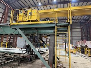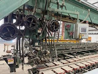 The One Sided Seam Welder welds plates to form multi-plate panels, without the need to flip the panels over to weld a back bead. A bridge beam supports a movable carriage that carries the welding equipment and controls. The welding controllers and the operator interface (touch screen) controls are grouped together on the carriage. The carriage uses a rack and pinion drive mechanism controlled by a solid state variable speed controller to provide the precise travel required for seam welding.