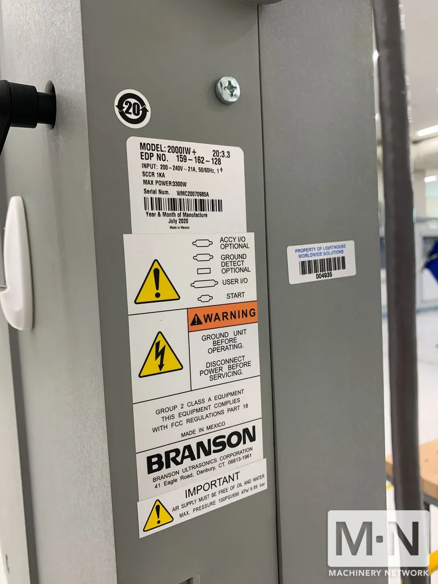 OverviewDescription3300 WATT BRANSON MODEL 2000IW+ ULTRASONIC WELDER MFG 2020 (5) AVAILABLE MAXIMUM FORCE: 630 lbs. at 100 psig (2.8 kN at 690 kPa)(3” cyl.)