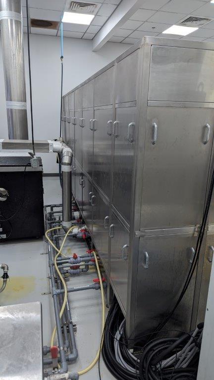All specifications are assumed to be correct but must be confirmed by the purchasing entity.,ELECTRICAL REQUIREMENTS POWER SUPPLY: 240V / 3-phase / 60Hz / 59 Amps All specifications are assumed to be correct but must be confirmed by the purchasing entity.,DIMENSIONS TANK (EACH): 10” (L) x 14” (W) x 10” (H), 8″ liquid depth All specifications are assumed to be correct but must be confirmed by the purchasing entity.,CONSOLE: 172” (L) x 34” (W) x 38” (H) All specifications are assumed to be correct but must be confirmed by the purchasing entity.,OVERALL SYSTEM WITH CTS-250: 201” (L) x 41” (W) x 84” (H) All specifications are assumed to be correct but must be confirmed by the purchasing entity.,WEIGHT MAX BASKET LOAD (STANDARD CONFIG): 35 lbs All specifications are assumed to be correct but must be confirmed by the purchasing entity.,MAX BASKET LOAD (OPTIONAL CONFIG): Up to 200 lbs (spring adjustment required) All specifications are assumed to be correct but must be confirmed by the purchasing entity.,PROCESS STATIONS (10 total) Load Station All specifications are assumed to be correct but must be confirmed by the purchasing entity.,Ultrasonic Immersion Wash All specifications are assumed to be correct but must be confirmed by the purchasing entity.,Ultrasonic Spray-Over-Immersion Rinse All specifications are assumed to be correct but must be confirmed by the purchasing entity.,Nitric Acid Passivation (30%) All specifications are assumed to be correct but must be confirmed by the purchasing entity.,Citric Acid Passivation All specifications are assumed to be correct but must be confirmed by the purchasing entity.,Neutralization All specifications are assumed to be correct but must be confirmed by the purchasing entity.,Ultrasonic Spray-Over-Immersion Rinse All specifications are assumed to be correct but must be confirmed by the purchasing entity.,Spray-Over-Immersion Rinse All specifications are assumed to be correct but must be confirmed by the purchasing entity.,Recirculating Hot Air Dry (Max Temp: 230°F) All specifications are assumed to be correct but must be confirmed by the purchasing entity.,Unload Station (Gravity Roller Conveyor) All specifications are assumed to be correct but must be confirmed by the purchasing entity.,TANK CONSTRUCTION & MATERIALS TANKS: 316L Stainless Steel, #2B finish All specifications are assumed to be correct but must be confirmed by the purchasing entity.,FRAME: 304 Stainless Steel All specifications are assumed to be correct but must be confirmed by the purchasing entity.,ACCESS PANELS: 304 SS sliding and lift-out All specifications are assumed to be correct but must be confirmed by the purchasing entity.,COUNTERTOPS & BASE PLATE: 304 SS All specifications are assumed to be correct but must be confirmed by the purchasing entity.,PLUMBING: 300 series SS, Viton O-rings, Teflon encapsulated seals All specifications are assumed to be correct but must be confirmed by the purchasing entity.,CONTAINMENT: Spill containment pan holds 110% of largest tank volume All specifications are assumed to be correct but must be confirmed by the purchasing entity.,FLUID & AIR REQUIREMENTS DEIONIZED WATER: 1–3 GPM continuous, 4–6 GPM on demand @ 30–35 psi, 1–2 MΩ All specifications are assumed to be correct but must be confirmed by the purchasing entity.,COMPRESSED AIR (CDA): 65–70 CFM @ 30 psi All specifications are assumed to be correct but must be confirmed by the purchasing entity.,SHOP AIR: 1–2 CFM @ 60 psi All specifications are assumed to be correct but must be confirmed by the purchasing entity.,DRAIN: Unrestricted floor drain required All specifications are assumed to be correct but must be confirmed by the purchasing entity.,ULTRASONIC SYSTEM FREQUENCY: 132 kHz All specifications are assumed to be correct but must be confirmed by the purchasing entity.,ULTRASONIC POWER: 500 watts per tank, MW500 HMI/132 Generator All specifications are assumed to be correct but must be confirmed by the purchasing entity.,TRANSDUCERS: 12 modules direct bonded to tank bottoms All specifications are assumed to be correct but must be confirmed by the purchasing entity.,HEATING SYSTEM HEATERS: 2000W per tank (strip heat) All specifications are assumed to be correct but must be confirmed by the purchasing entity.,TEMP CONTROL: PLC-controlled with RTD probes All specifications are assumed to be correct but must be confirmed by the purchasing entity.,MAX TEMPS: All specifications are assumed to be correct but must be confirmed by the purchasing entity.,Station #2, 3, 7: 160°F All specifications are assumed to be correct but must be confirmed by the purchasing entity.,Station #4, 5, 6: 120°F All specifications are assumed to be correct but must be confirmed by the purchasing entity.,Station #8: 140°F All specifications are assumed to be correct but must be confirmed by the purchasing entity.,Station #9 (Dryer): 230°F All specifications are assumed to be correct but must be confirmed by the purchasing entity.,MONITORING & SENSORS CONDUCTIVITY: 0.01–10,000 µS, 3-point range All specifications are assumed to be correct but must be confirmed by the purchasing entity.,PH: 0–14 range, sensors in Neutralize and Wash Stations All specifications are assumed to be correct but must be confirmed by the purchasing entity.,SAFETY SENSORS: EMO button, emergency pull cable, basket sensors All specifications are assumed to be correct but must be confirmed by the purchasing entity.,BARCODE SYSTEM: Rack tracking and recipe recall All specifications are assumed to be correct but must be confirmed by the purchasing entity. |