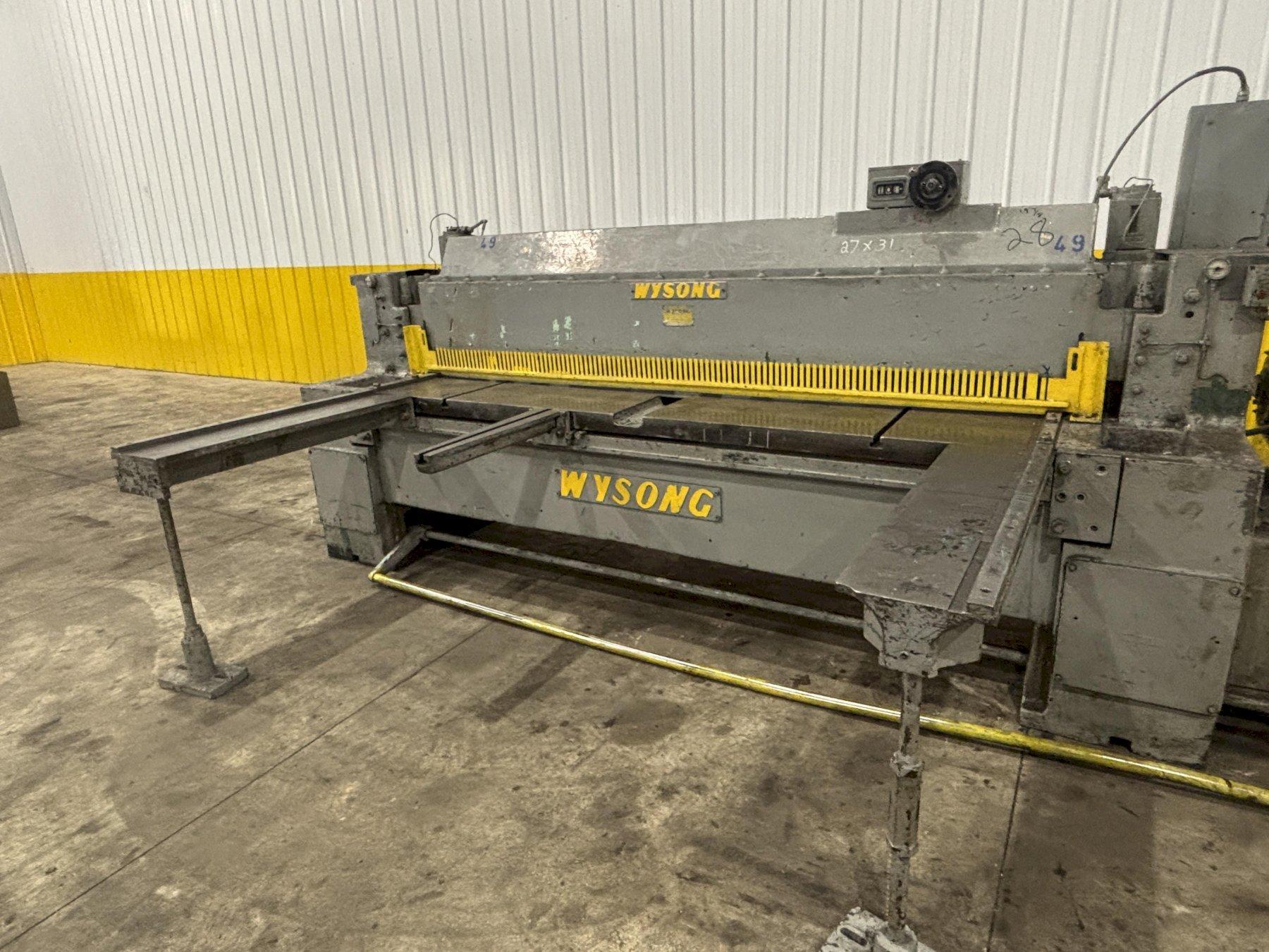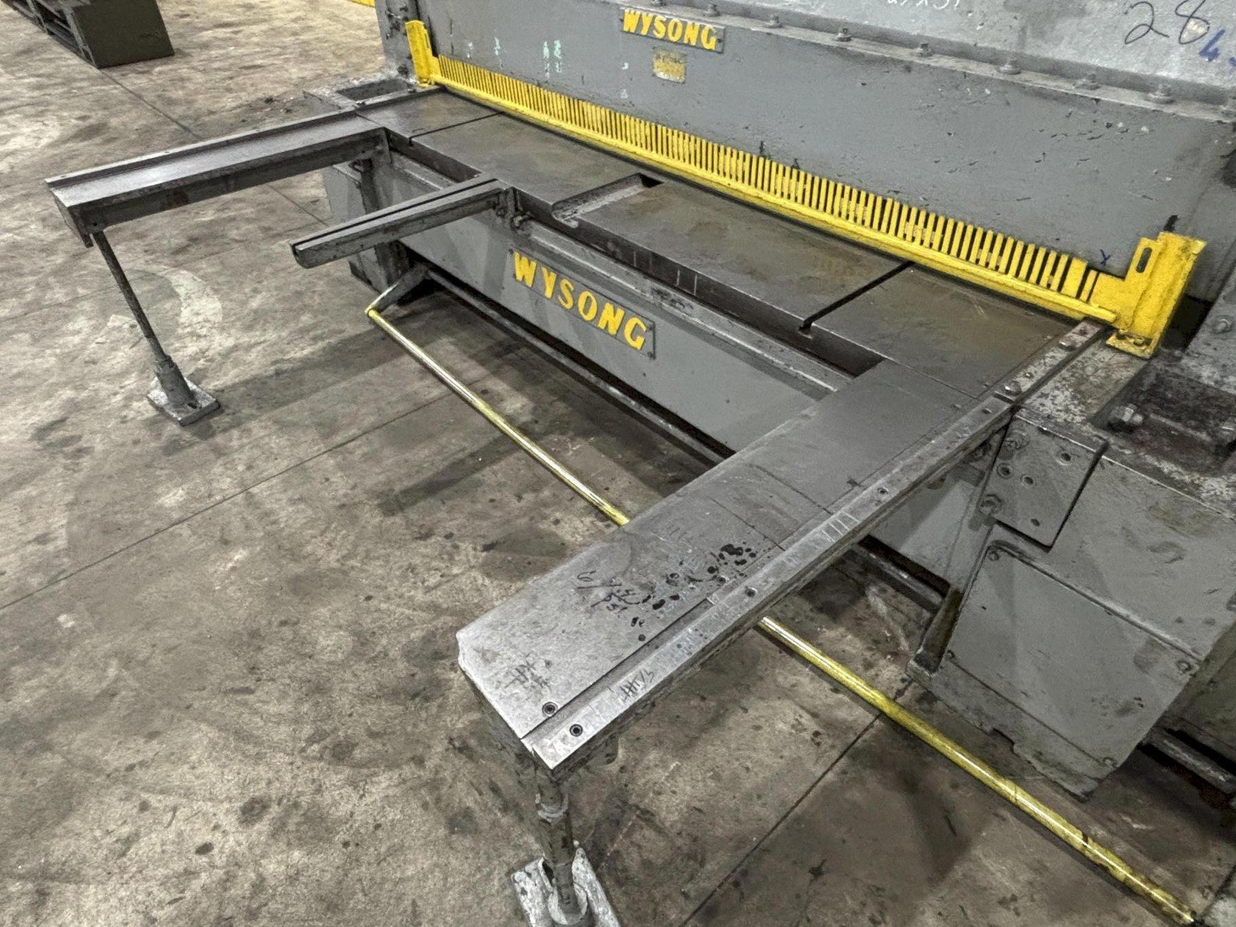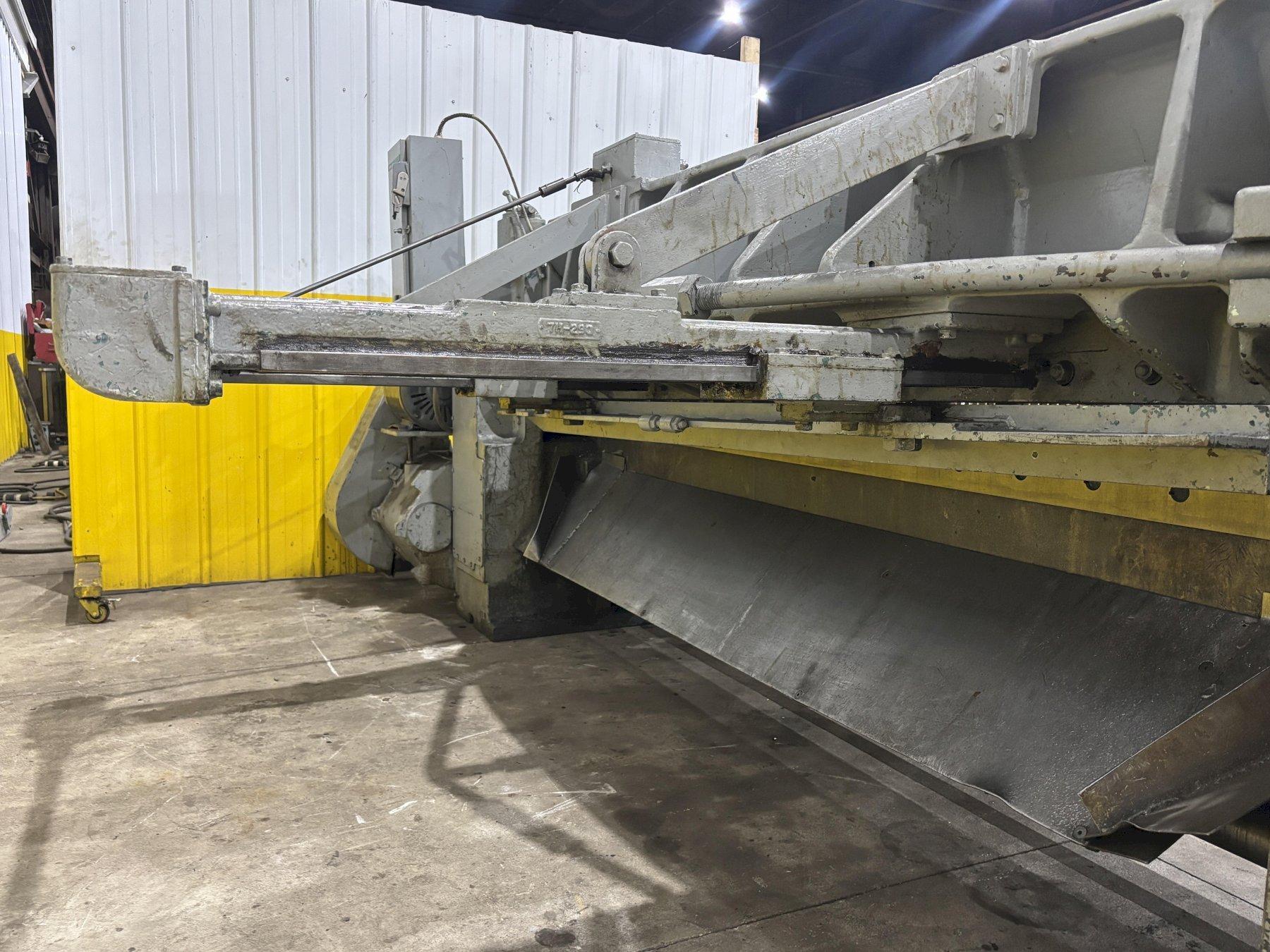 BACK GAUGE 24" MOTORIZED SPEED 60 SPM Machine Model No.: 796 Rated Capacity: 8' of 3/16" Mild Steel Rated Capacity: 12 Ga. of Stainless Steel Cutting Length: 96" Powered Back Gage Range: 35" Distance Floor to Table: 33" +/- Single Axis Power Back Gage With Read Out Foot Bar Trip Control (2) Adjustable Long Front Material Support Arms (2) 42" Long Squaring Arm - Right & Left (1) Set of 4 Edge Knives in Good Condition Bijur Pressurized Lubrication System Full Length Finger Guard Material Hold Downs Mechanical Clutch 15 HP Main Moto 3/4 HP Back Gage Motor Overall Size: 146" LR x 81" F-B (w/o sq arm and supports) x 70" High x 11,750 Lbs. |