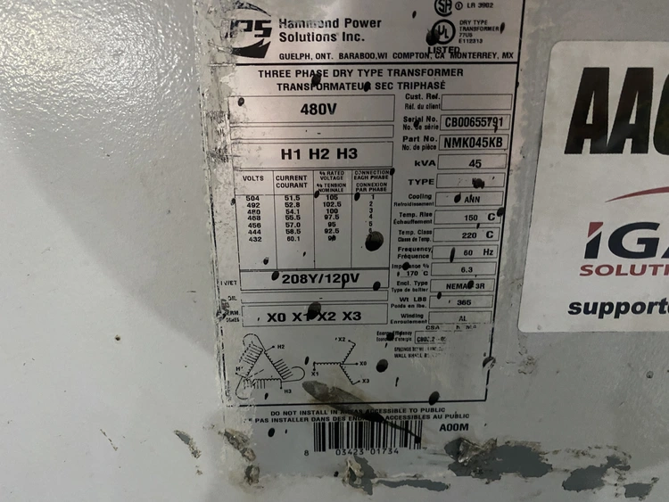 OverviewHammond Power Solutions NMK045KB used General Purpose Transformer. Reliable manufacturer, model NMK045KB. Ideal for various applications. Cat NO. NMK045KB Pri. Volts: 480V Sec. Volts: 208Y/120V 3PH, 45kVA, 60HZ TYPE K Encl. Type: NEMA-3R Hammond Power Solutions NMK045KB used General Purpose Transformer. Reliable manufacturer, model NMK045KB. Ideal for various applications. Cat NO. NMK045KB |