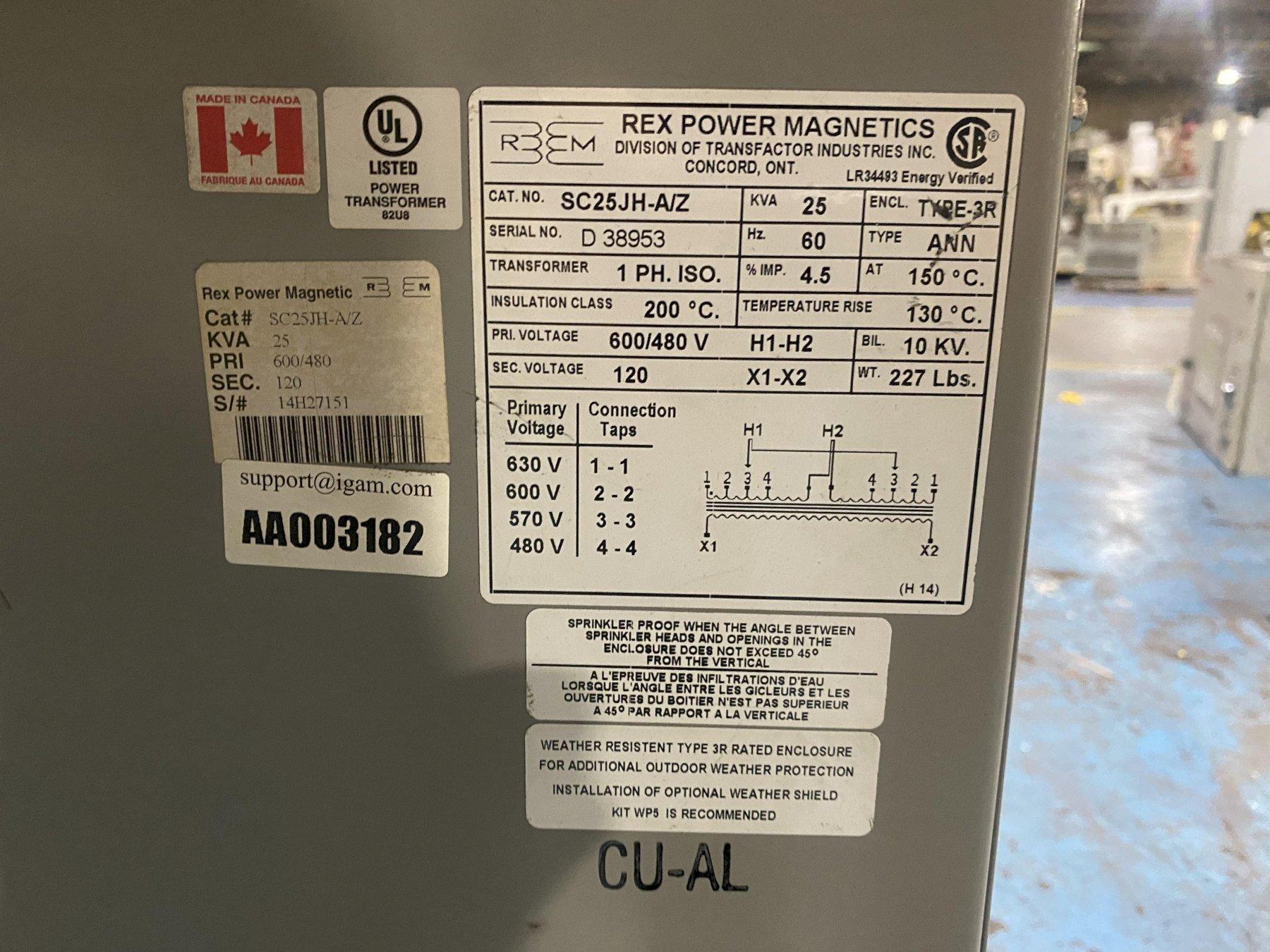 OverviewThe Rex Power Magnetics SC25JH-A/Z is a used single-phase dry-type transformer designed to step down primary voltages of 600/480V to a secondary output of 120V. With a power rating of 25 kVA, this transformer delivers efficient and reliable voltage conversion for commercial and light industrial applications. Housed in a NEMA Type 3R enclosure, it’s suitable for both indoor and outdoor installation, offering safe and robust performance even in demanding environmental conditions. Built by Rex Power Magnetics, a trusted name in electrical power products, this unit is engineered to meet modern energy and safety standards. Product Specifications: