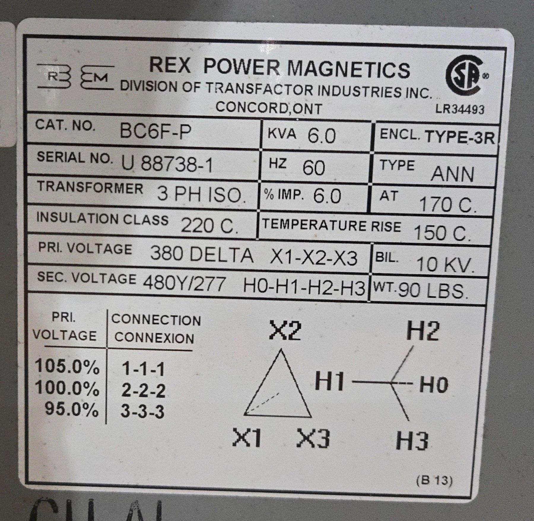 Rex Power Magnetics – BA45H-M/Z Transformer 480V – 208Y/120V , 45kVA USED