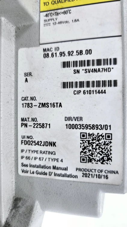 OverviewThe Allen-Bradley 1783-ZMS16TA ArmorStratix 5700 is a used industrial managed Ethernet switch designed for rugged, high-performance networking in industrial environments. Featuring advanced security, real-time data management, and robust connectivity, this switch ensures efficient and reliable communication between PLCs, HMIs, and other industrial devices. With an IP67-rated enclosure, it is built for on-machine applications in manufacturing, process control, and factory automation. Product Specifications