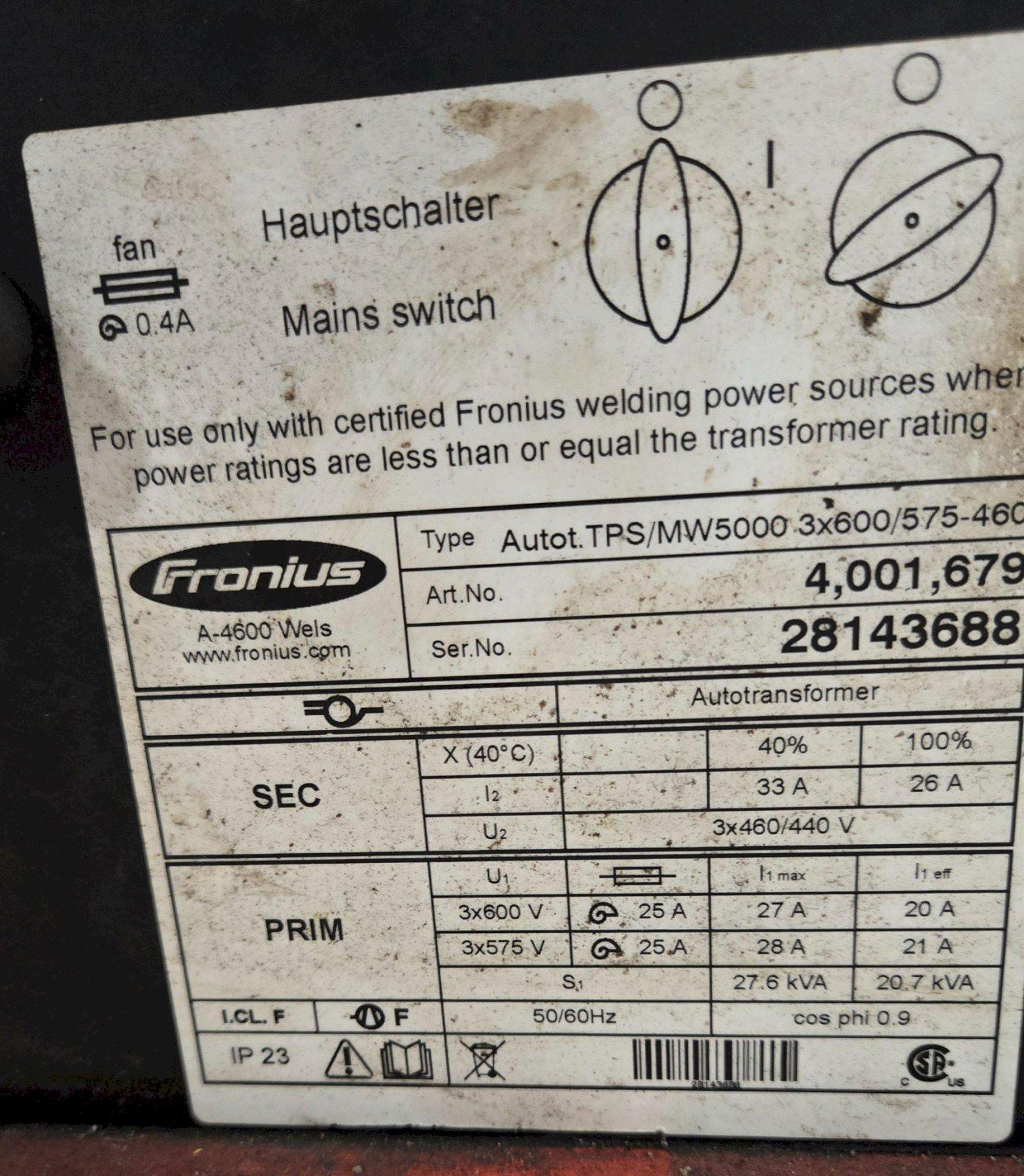 OverviewThe Fronius TransPuls Synergic 4000 Welder with TPS/MW5000 Inverter is a used high-performance welding system, engineered for professional-grade MIG/MAG welding tasks. Operating at 460V, this synergic welder is designed to deliver precision control and consistent weld quality across various materials and thicknesses. The integrated MW5000 inverter ensures efficient power conversion and enhanced arc stability. This advanced welding unit is suitable for industrial settings requiring complex weld sequences, and it includes synergic functionality for automatic parameter adjustments based on selected welding programs. Note: Equipment is sold as is. Product Specifications