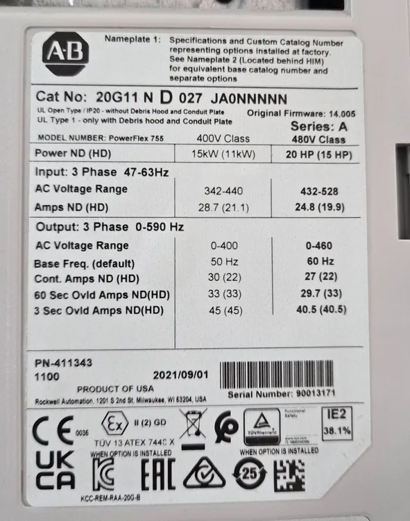 OverviewThe ALLEN BRADLEY 20G11 ND027 JA0NNNNN Drive Series A is a high-performance PowerFlex 755 AC drive designed for precise motor control and energy efficiency in industrial applications. Manufactured in 2021 and in used condition, this drive offers reliable performance, advanced motor control features, and seamless integration with automation systems. It is an ideal choice for manufacturing, material handling, and energy-saving motor applications. Product Specifications