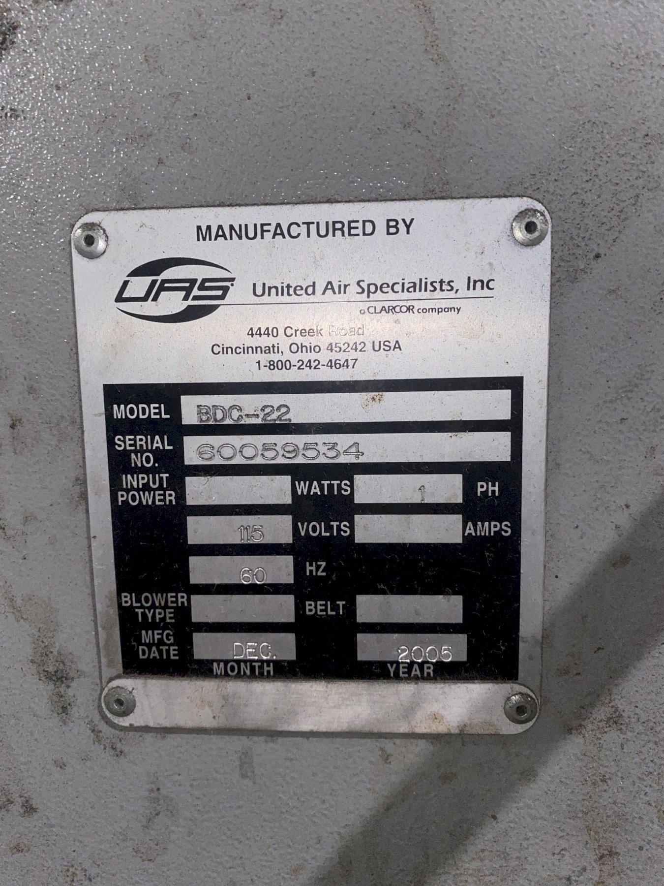 OverviewThe UNITED AIR SPECIALISTS BDC-22 Dust Collector is a used compact filtration unit designed to remove airborne dust, fumes, and fine particulate matter from industrial and commercial environments. Operating on 115V, 60Hz, single-phase power, the BDC-22 is ideal for smaller workspaces, laboratories, and equipment enclosures where point-source dust control is required. Built with durability and ease of maintenance in mind, this unit provides effective air filtration for improved workplace safety and cleanliness. Product Specifications: