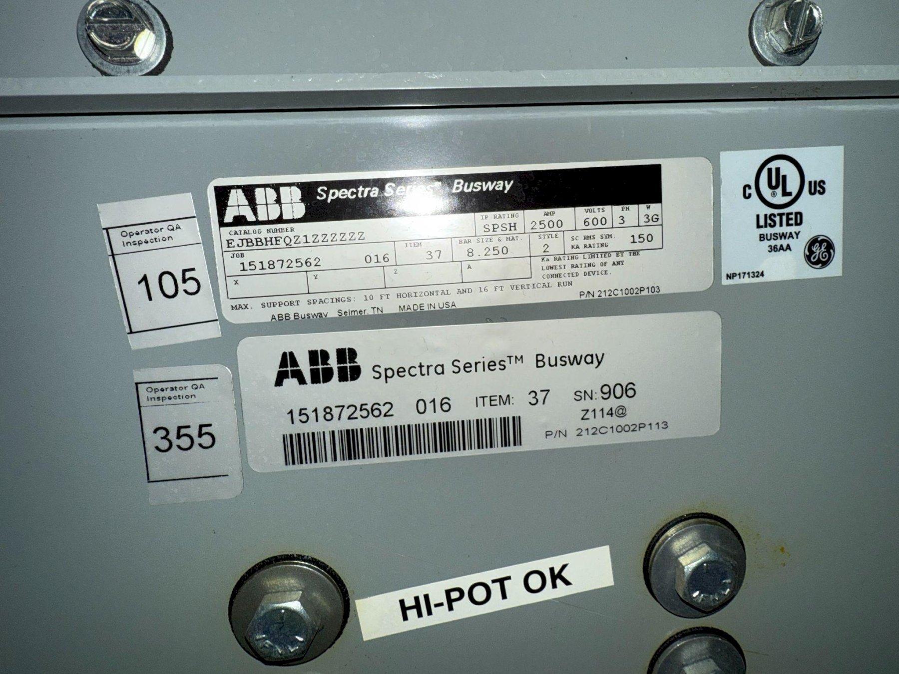OverviewThe ABB Busway Model EJBBHFQZ1ZZZZZZ BB 2500A Spectra Series Copper Center Tap Box is a brand new heavy-duty power distribution component engineered for high-capacity electrical systems. Rated for 2500 amps and 600V, this Spectra Series center tap box is designed to deliver efficient and reliable power in large-scale industrial and commercial settings. Featuring a 3-phase, 3-ground (3PH, 3G) configuration, and constructed with copper conductors, this unit ensures optimal conductivity, minimal losses, and long service life. It’s an ideal solution for high-current busway systems requiring a center tap for balanced load distribution. Product Specifications: