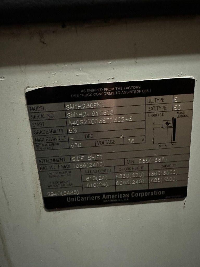 OverviewThe Used 2015 UNICARRIERS SRX35N Reach Truck is a dependable stand-up, single reach forklift built for efficient operation in narrow aisle warehouse environments. With only 5,730 hours of use, this unit combines robust performance with refreshed aesthetics—featuring a brand-new coat of UniCarriers grey paint. Designed for precision and comfort, it includes side shift functionality and a responsive control system, making it an excellent choice for high-density pallet storage and fast-paced warehouse workflows. Product Specifications
