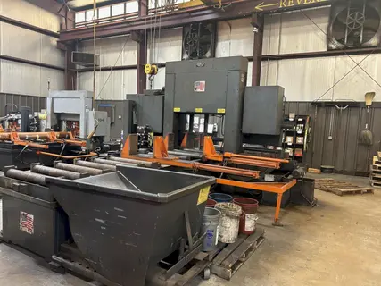 • 25″ X 25″ (W) Capacity • 2″ X 22′ X .063″ Blade • 15 Horsepower Motor • Hydraulic Machine • 5HP Hydraulic System • Manual Control – Swing Away Console • Joystick Arm Height Control • Guide Cap Camlocks • Powered Blade Tension • Powered Moveable Guide Arm • Cut Watcher System • Push Button Blade Speed with LED Readout • Full Stroking Vises • Flood Coolant System • Blade Chip Brush • 24″ Roller Discharge Table • Flat Carbide Blade Guides • Adjustable Clamping Pressure (0-2,500 Lbs) • Adjustable Feed Rate & Cutting Pressure • Adjustable Blade Speed (70-500 Sfm) • Blade Guards • 220/440/3ph Electrical Motor Requirement |
