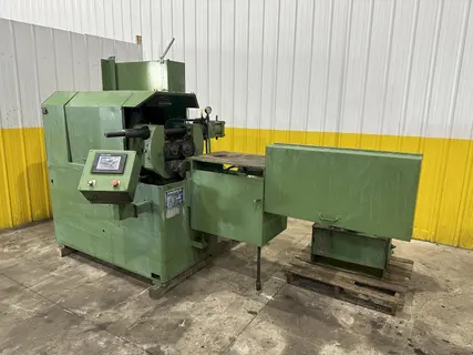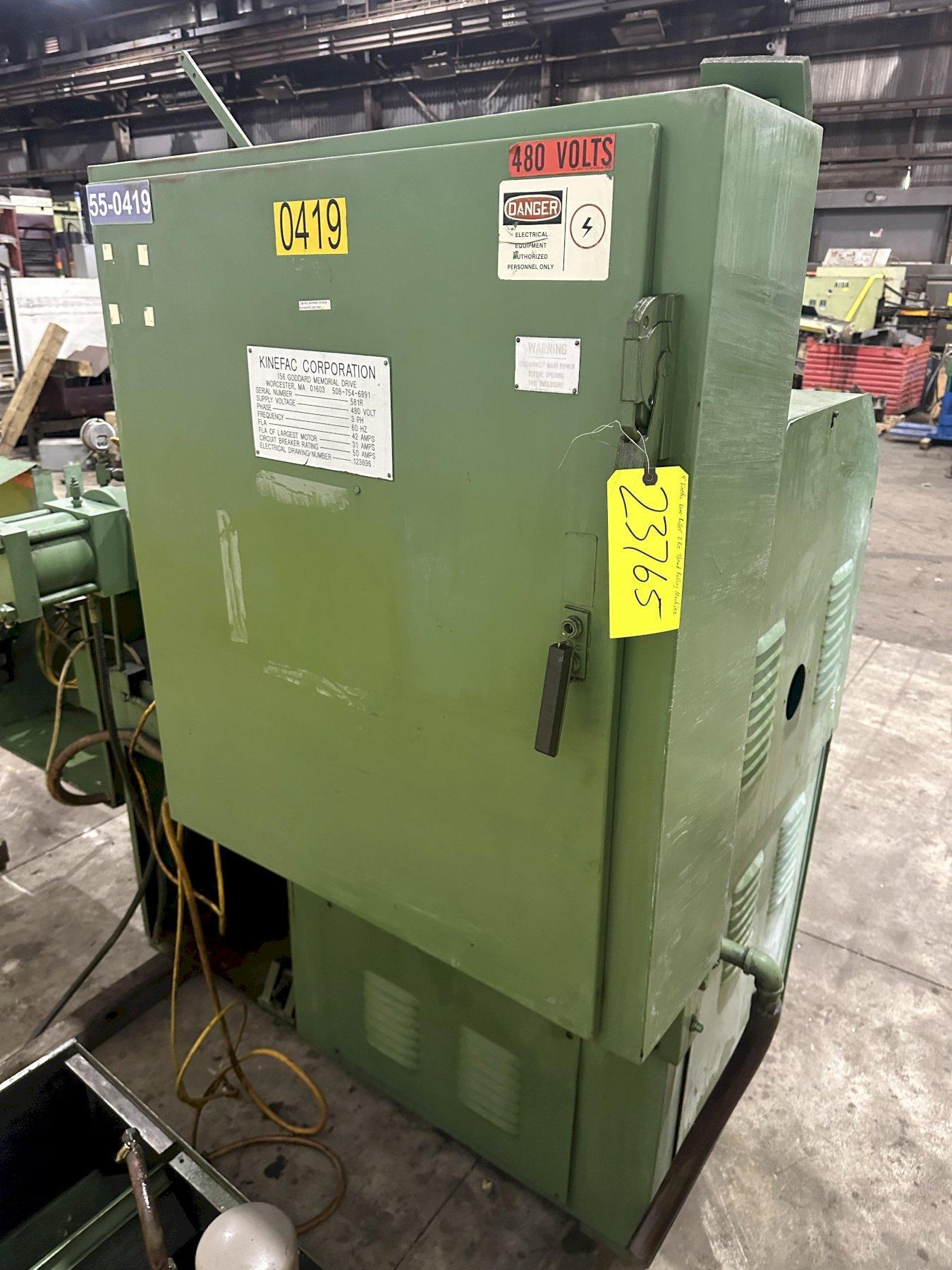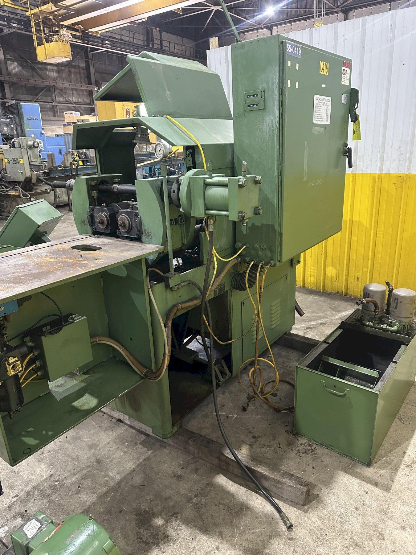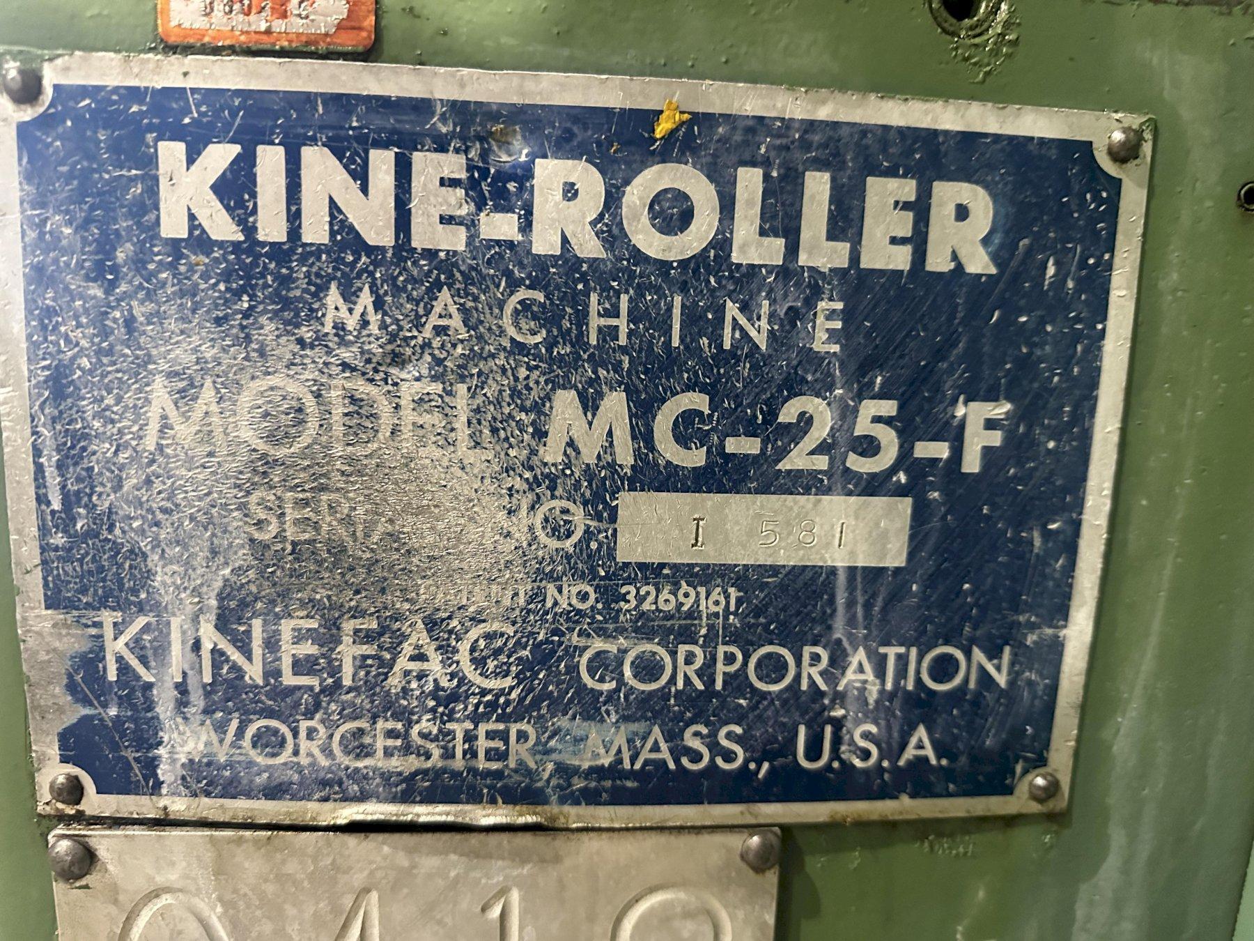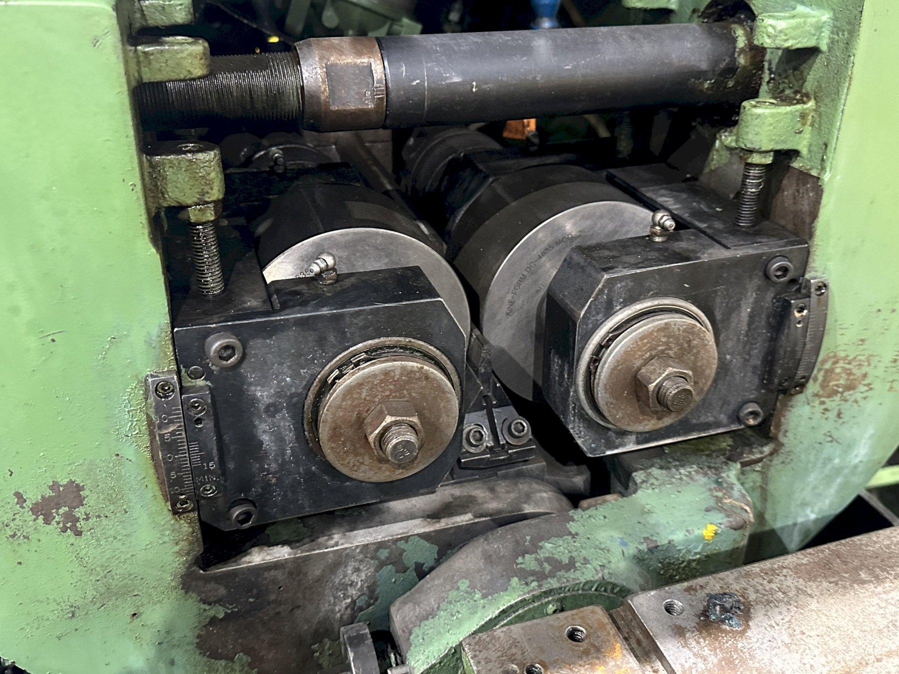 MODEL ........... MC-25-F The Kinefac MC-25-F is a 2-die cylindrical thread rolling machine with a ~2.5" maximum spindle diameter and 25 HP motor, designed for high-precision threading and form rolling of shafts and pins, with capacities including: a 2.5" maximum diameter for various components like threaded rod, ball blanks, and shallow forms; a 2.5" diameter for long thrufeed roll finishing; and a ~4.5" max die length.