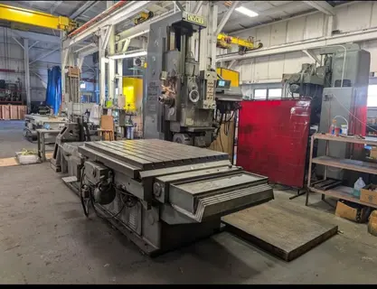 SPINDLE SIZE.....................: 4" SPINDLE TRAVEL...................: 20" HORIZONTAL TRAVEL................: 72" VERTICAL TRAVEL..................: 60" TABLE RETRACTION.................: 20" TABLE SIZE.......................: 60" X 40" SPINDLE TAPER....................: 50 SPINDLE SPEEDS...................: (16) 25-1450 RPM SPINDLE BAR FEEDS................: (8) .002 - .024 IPR SPINDLE RAPID TRAVERSE...........: 95 IPM MILLING FEED RATES...............: (16) .5 - 36 IPM MILLING RAPID TRAVERSE...........: 50 IPM, 150 IPM DIGITAL READ-OUT.................: 3 AXIS ACU RITE HEAD LOCK........................: YES SADDLE LOCK......................: YES POWER DRAW BAR...................: YES HP...............................: 20 |