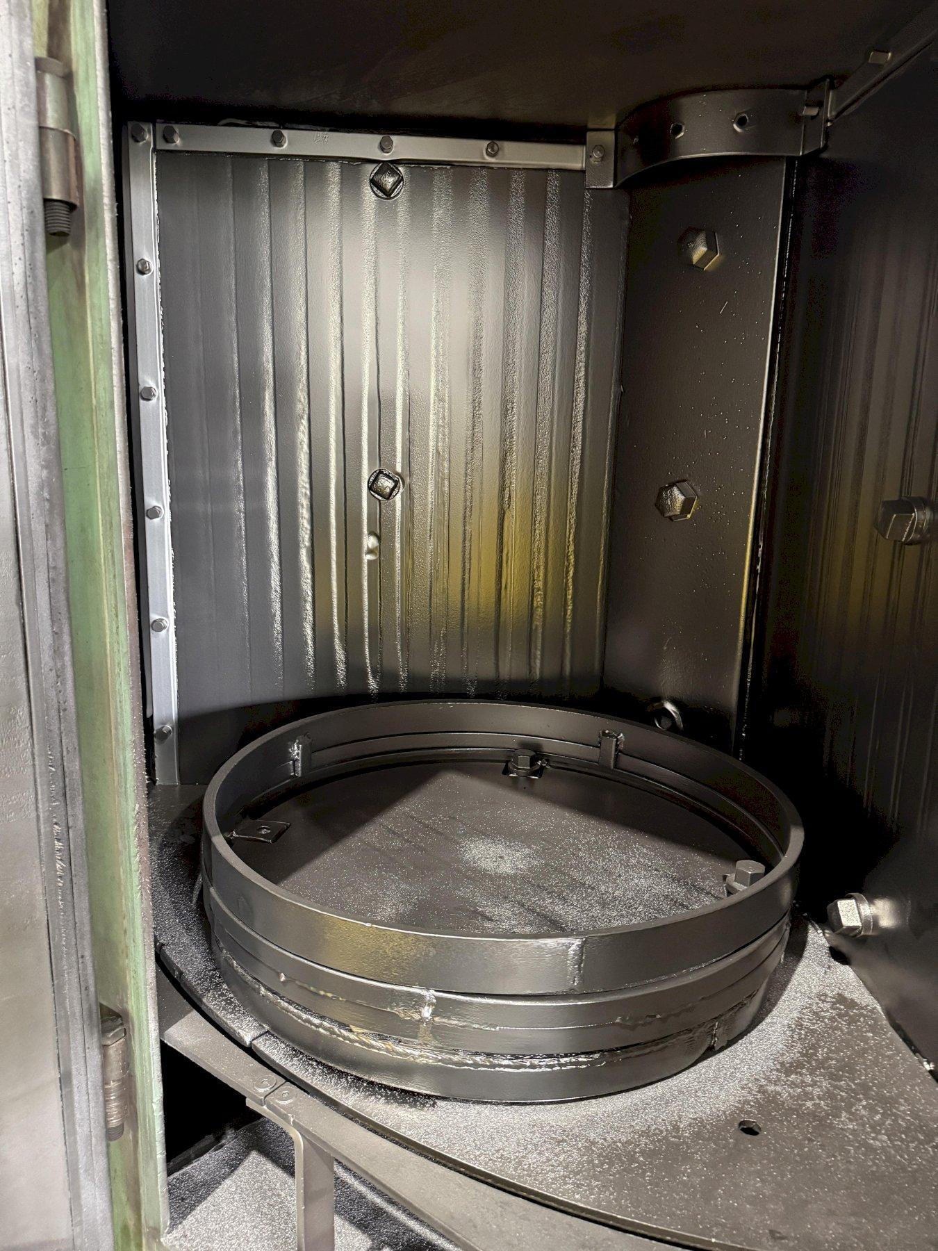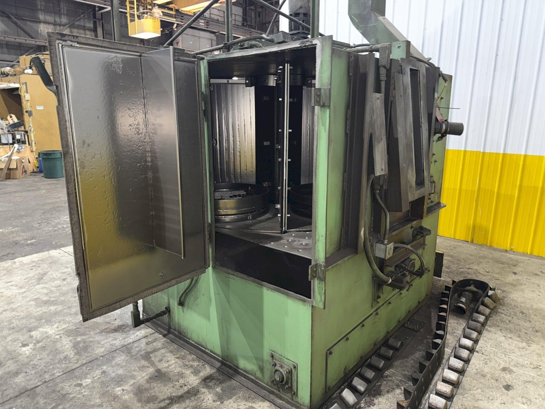 BLAST WHEELS 1 @ 20 HP TYPE ROTARY TABLE TABLE DIAMETER 72" STATIONS 4 MOTORIZED TURNTABLES 4 @ 26" DIAMETER PART HEIGHT ON TURNTABLE 34" CABINET PART HEIGHT 40" LOAD HEIGHT 40" +/- STATION SEPARATION DOORS 28" X 38" REPLACEABLE SHOT AUGER SHOT ELEVATOR SHEEL MOTOR CURRENT READY OUT BLAST TIME TIMER 0 TO 5 MINUTES WHEEL MOTOR 20 HP TABLE MOTOR 1 HP SPINNER MOTOR 1 HP ELEVATOR MOTOR 1.5 HP |